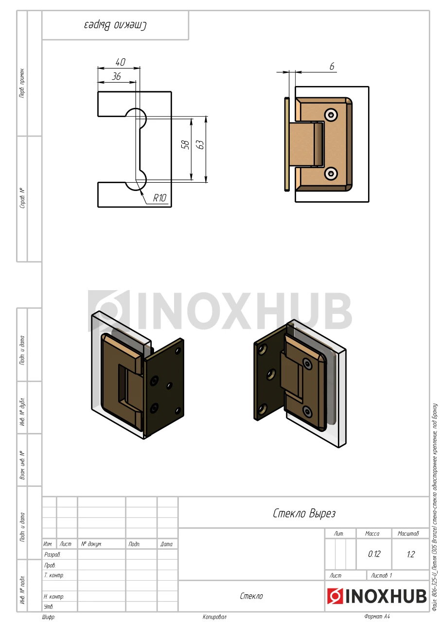 Сборка и монтаж. Перед установкой необходимо подготовить стекло и собрать петлю согласно чертежам и схемам. В комплекте поставляются уплотнители для прочной фиксации стеклянной панели. Стекло зажимается между пластинами петли, которые соединяются двумя шестигранными болтами. Установочная площадка крепится на 3 болта к стене с одной стороны.