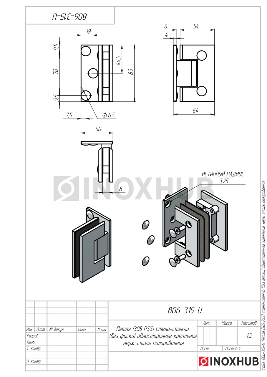 Петля (305 PSS) стена-стекло (без фаски) одностороннее крепление, нерж. сталь полированная