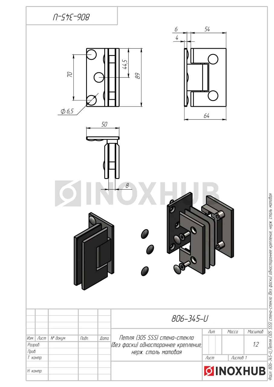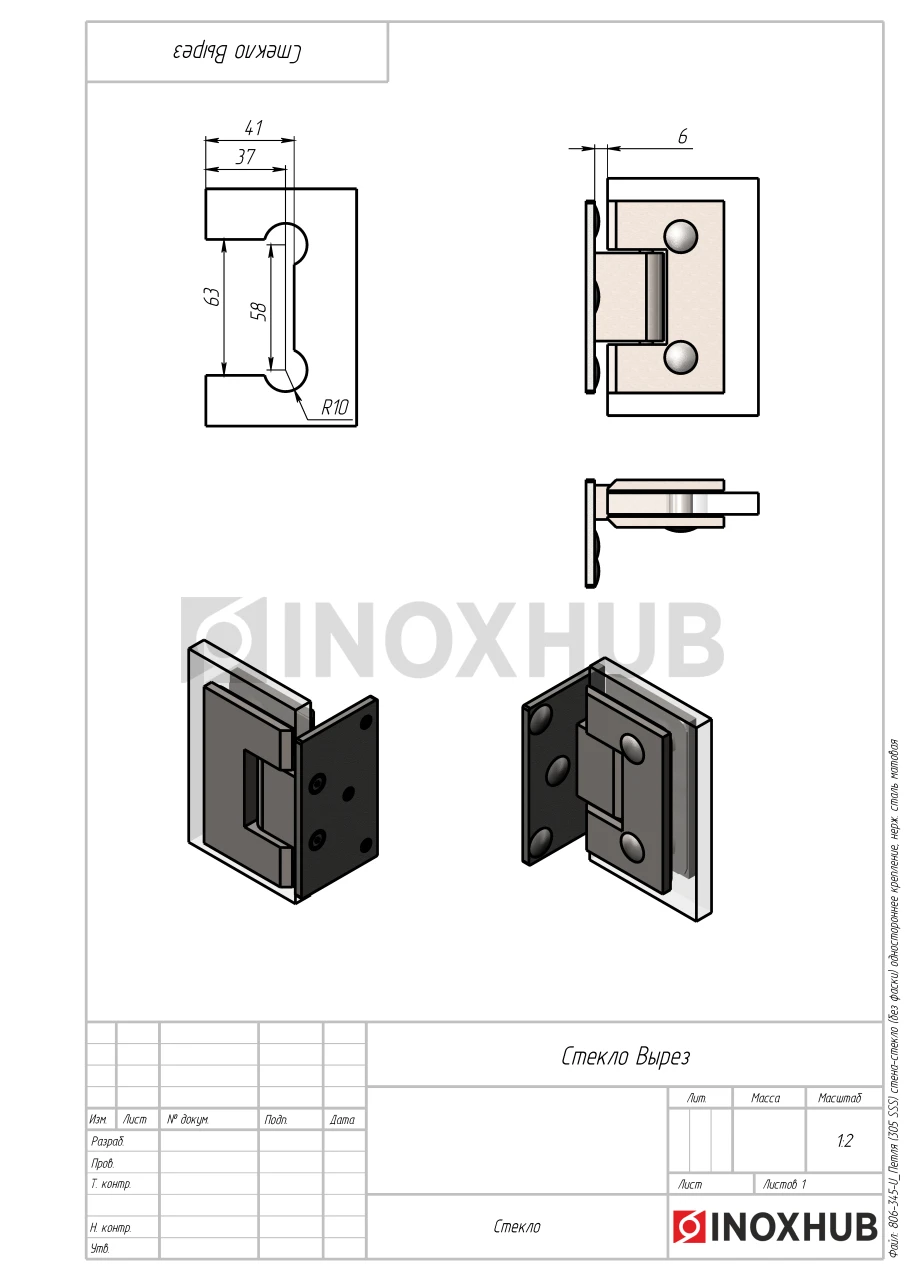 Сборка и монтаж. Перед установкой необходимо подготовить стекло и собрать петлю согласно чертежам и схемам. В комплекте поставляются прокладки для прочной фиксации стеклопанели. Стекло зажимается между пластинами петли, которые соединяются двумя шестигранными болтами. Установочная площадка крепится на 3 болта к стене с одной стороны.