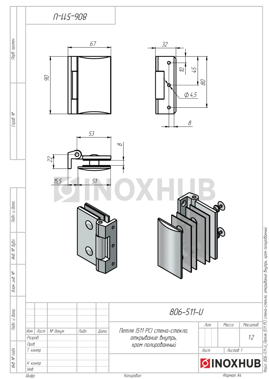 Петля (511 PC) стена-стекло, открывание внутрь, полированный хром