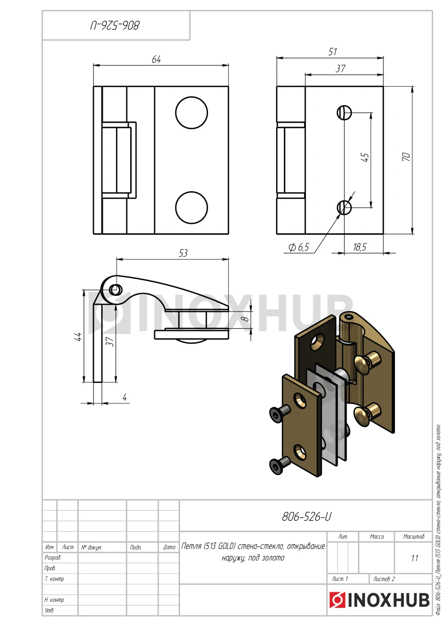 Петля (513 Gold) стена-стекло, открывание наружу, под Золото