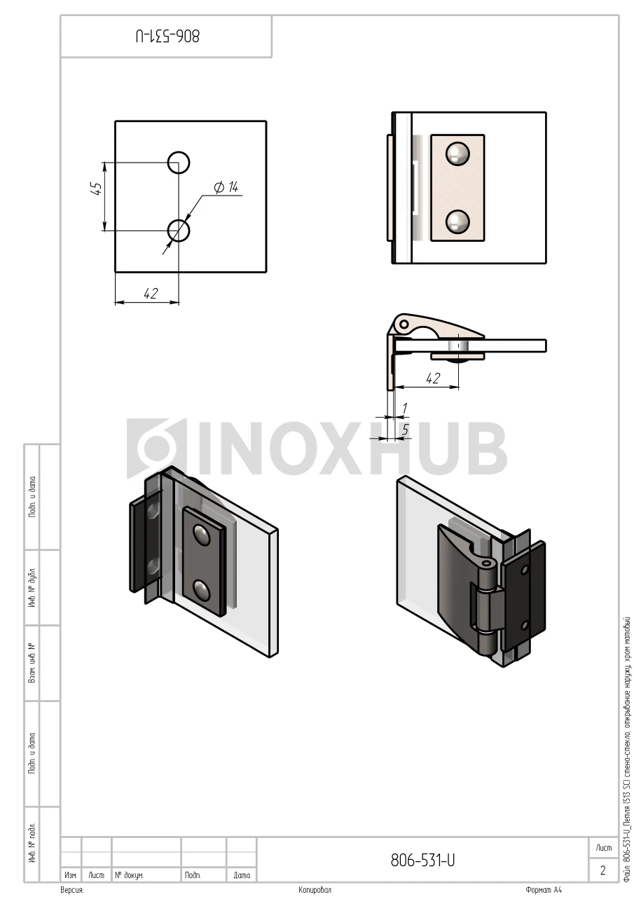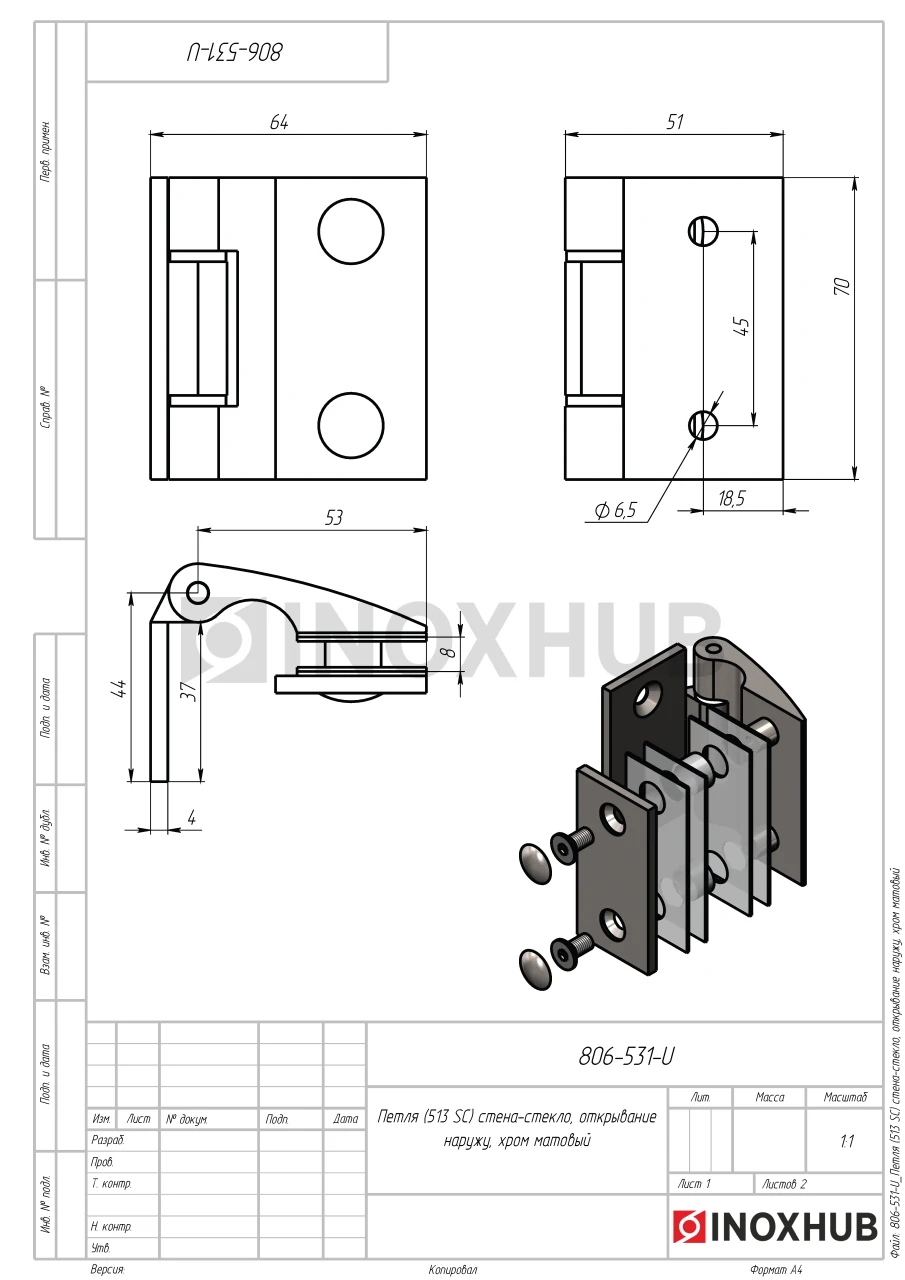 Сборка и монтаж. Подготовьте отверстия в стене и двери согласно чертежу. Петля не требует реза уплотнителя, все крепежные элементы поставляются в комплекте. Модель устанавливается на шестигранные винты.