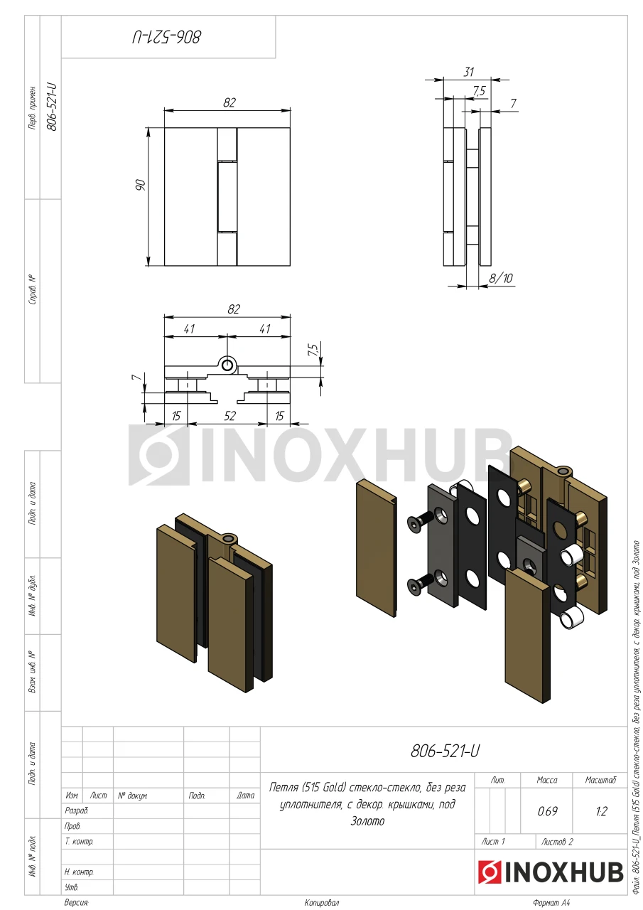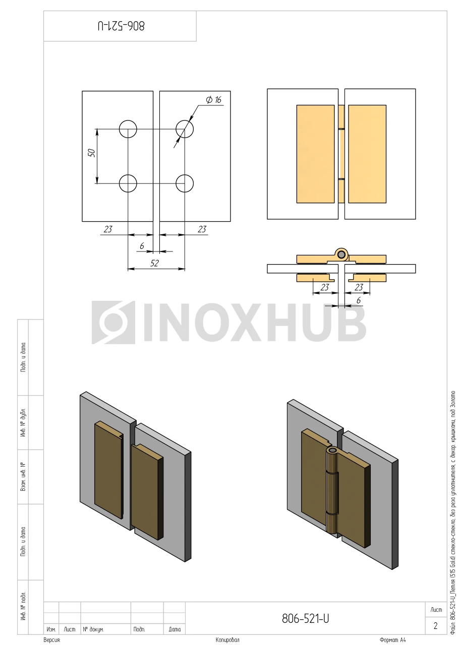 Петля (515 Gold) стекло-стекло, без реза уплотнителя, с декоративными крышками, под Золото