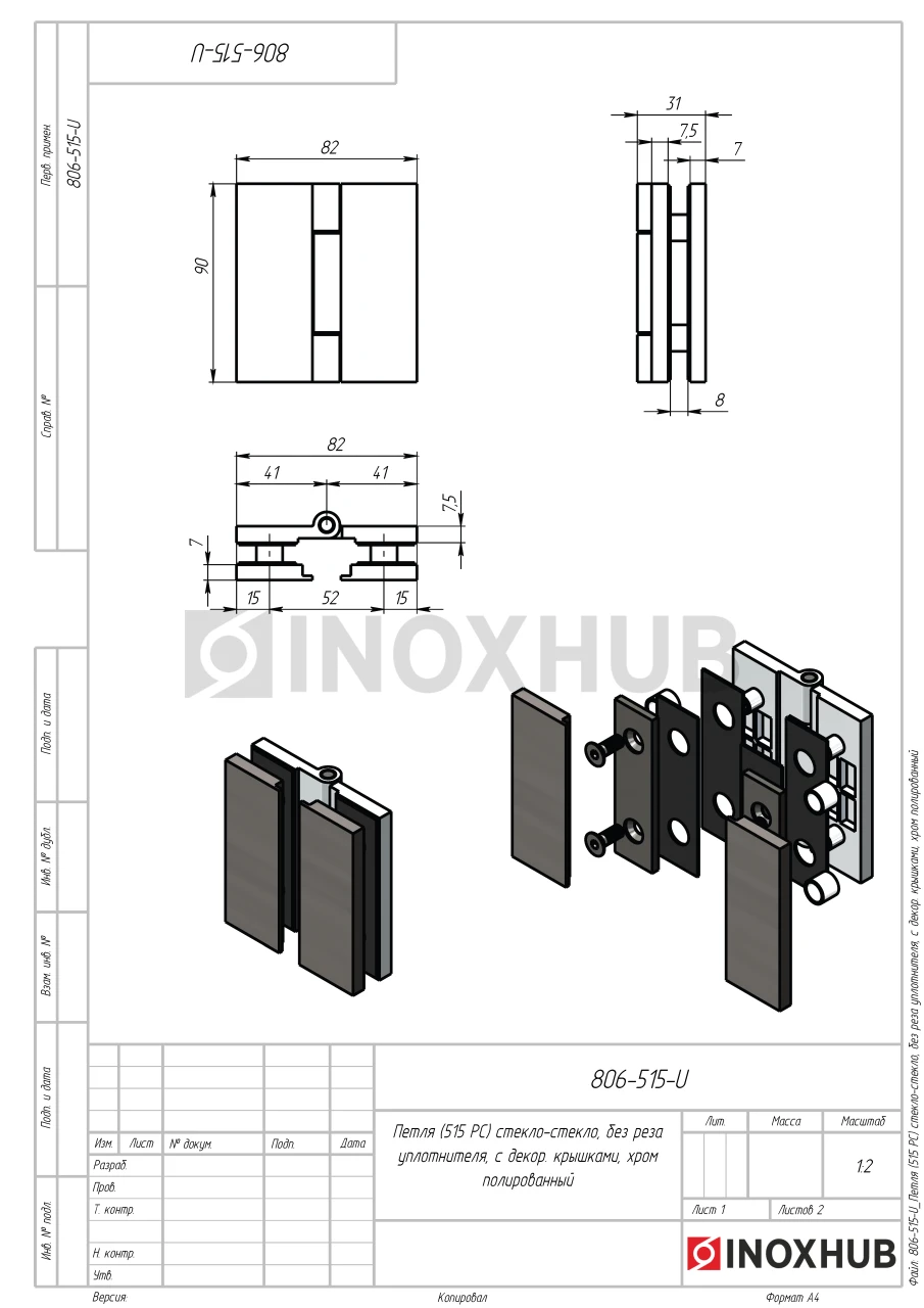 Петля (515 PC) стекло-стекло, без реза уплотнителя, с декоративными крышками, полированный хром