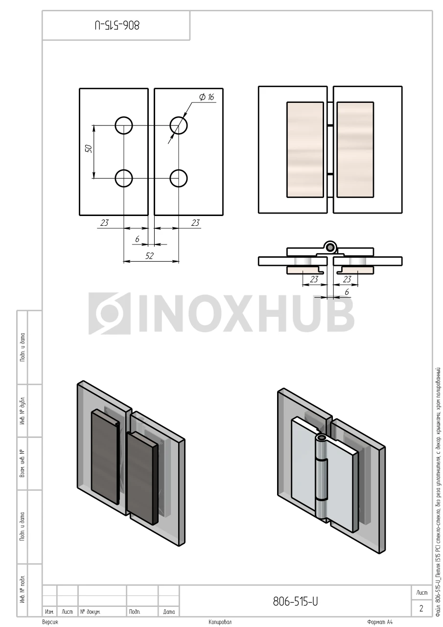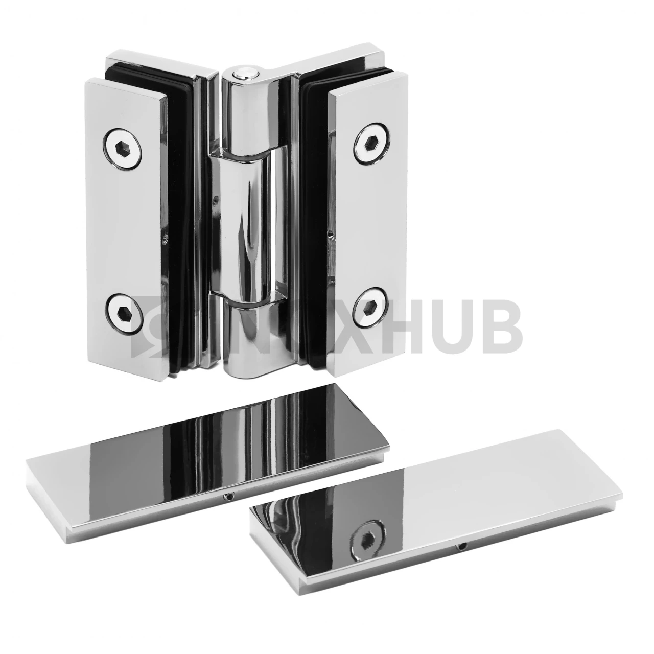 Применение. Модель используется для монтажа стеклянной двери к стационарному стеклу в одной плоскости. Толщина стеклопанели — 8 мм, ширина двери — до 600 мм. Модель подходит для стандартных душевых кабин, а также дверных систем типа «гармошка». Петля обеспечивает открытие двери в одну сторону на 180°. Декоративные крышки прикрывают винты, придавая механизму более эстетичный и завершенный вид.