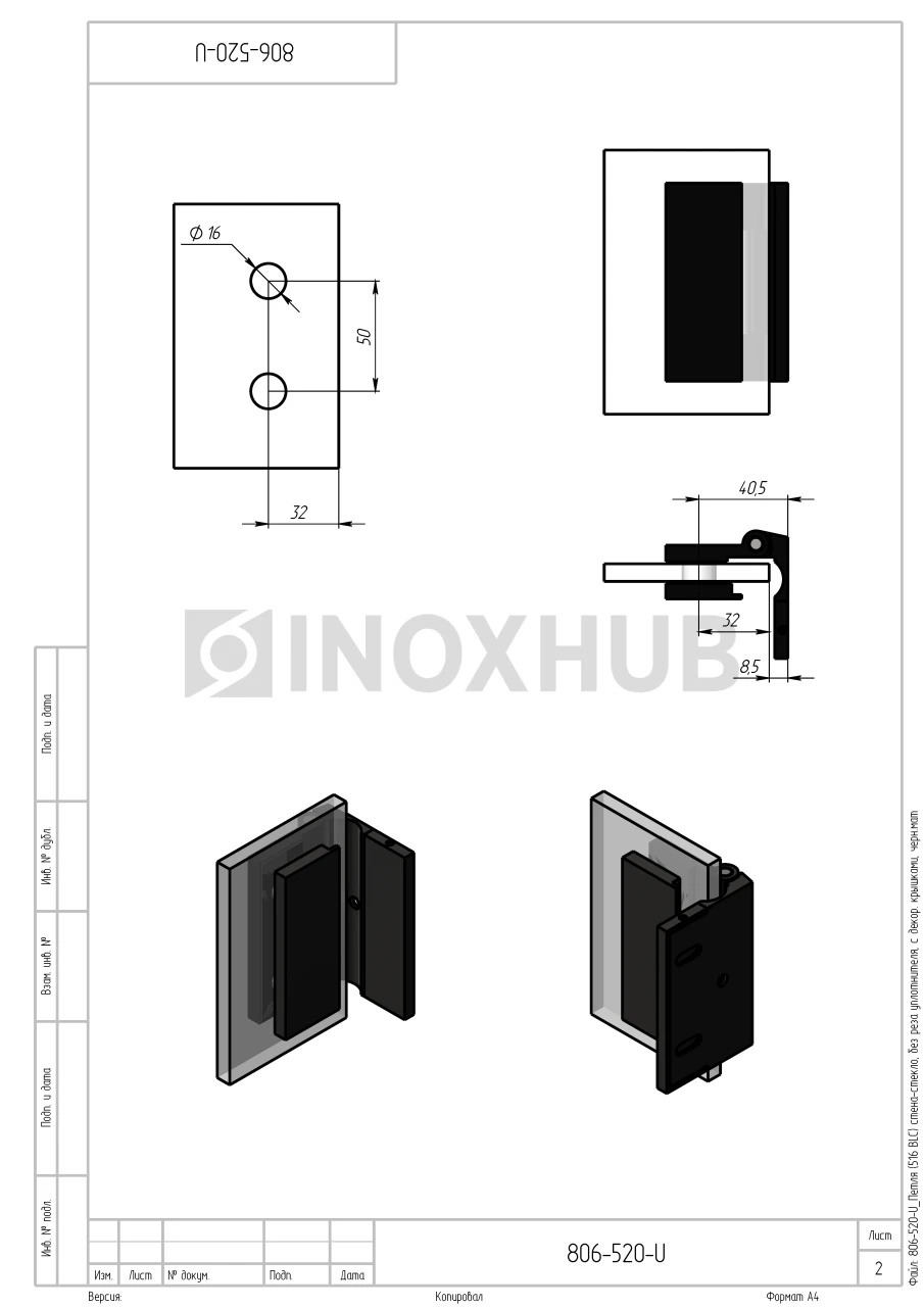 Применение. Модель используется для монтажа стеклянной двери к стене под углом 90°. Толщина стеклопанели — 8 мм, рекомендуемый вес дверного полотна на обе петли — до 30 кг, ширина двери — до 600 мм. Модель подходит для стандартных душевых кабин, а также дверных систем типа «гармошка». Петля обеспечивает открытие двери в одну сторону. Декоративные крышки прикрывают винты, придавая механизму более эстетичный и завершенный вид.