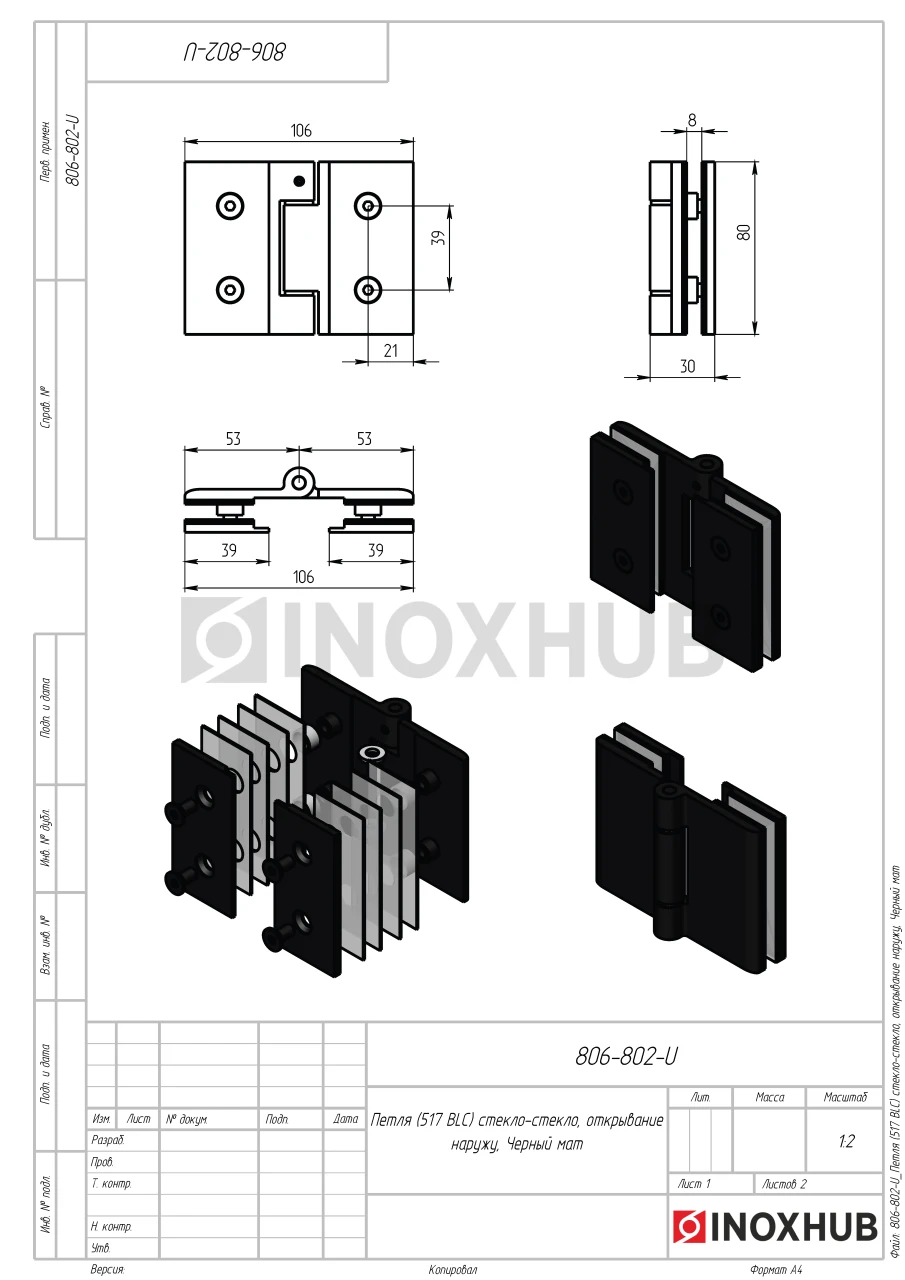 Петля (517 BLC) стекло-стекло, открывание наружу, Черный мат