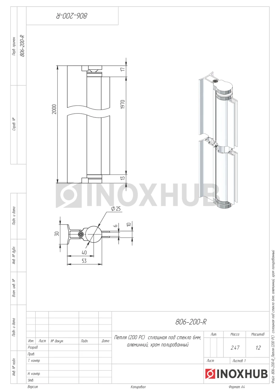Петля (200 Al) сплошная, L=2000 мм, стекло 6.0 мм, алюминий, полированный хром