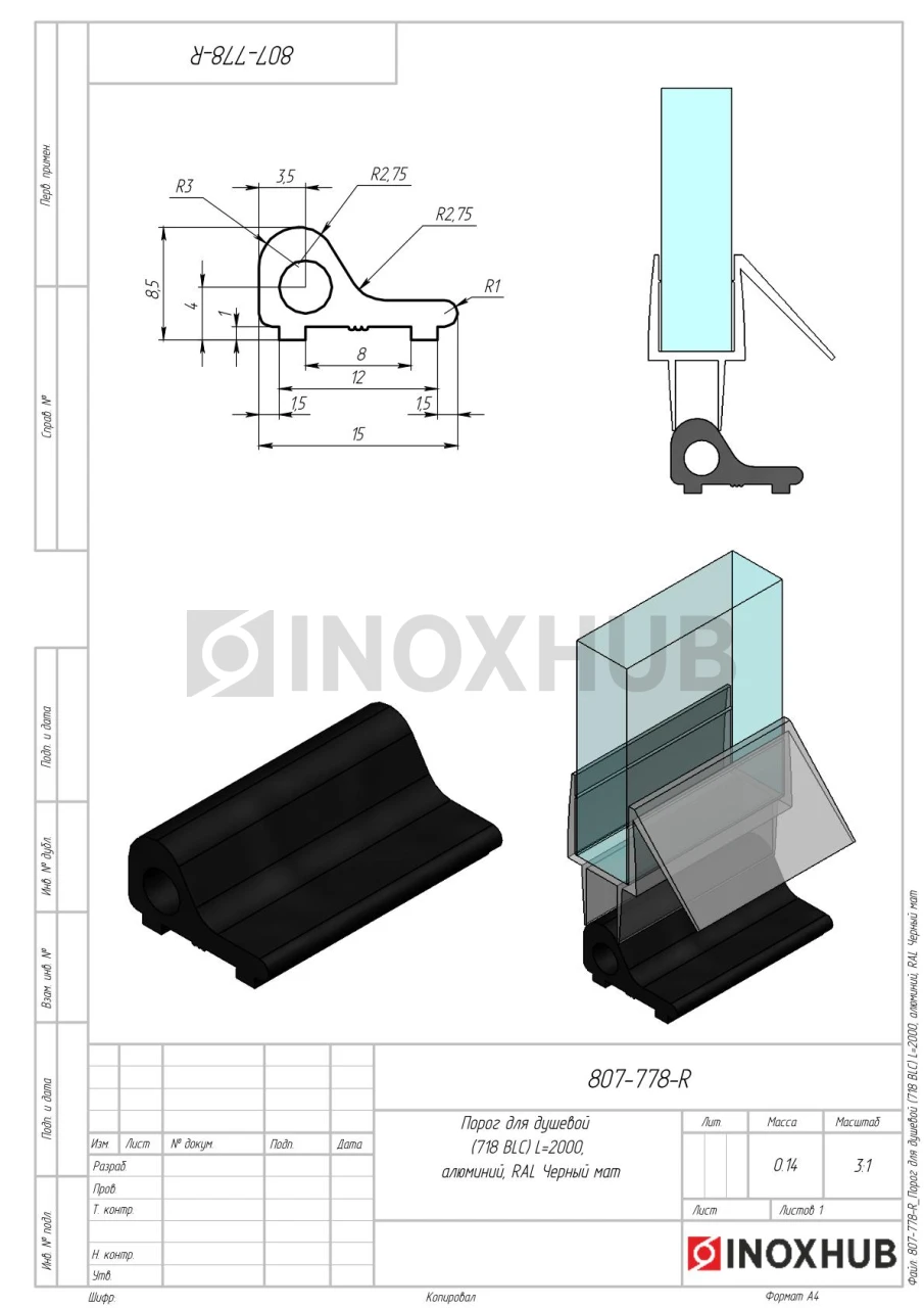 Порог для душевой (718 BLC), L=2000, алюминий, RAL Черный мат