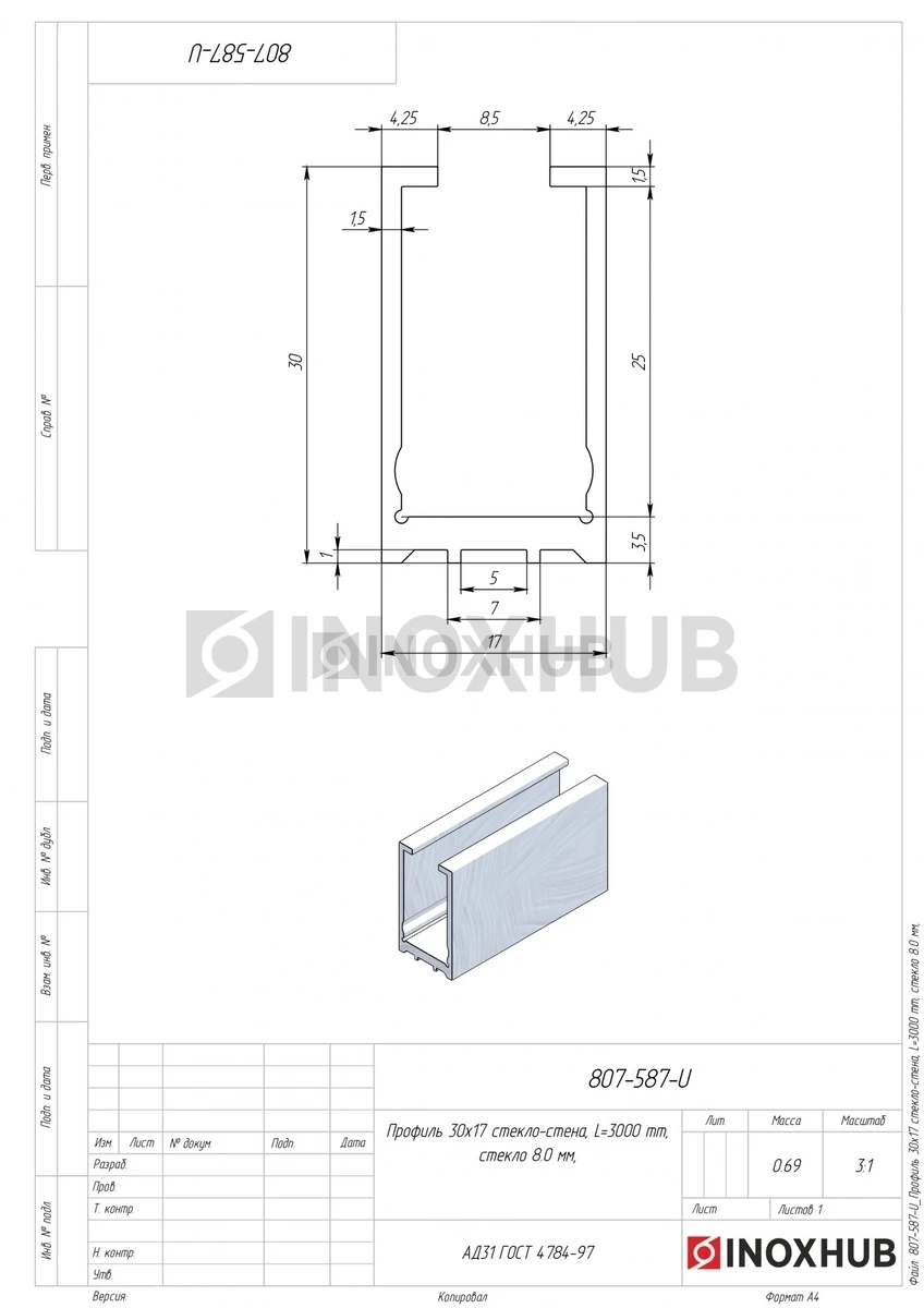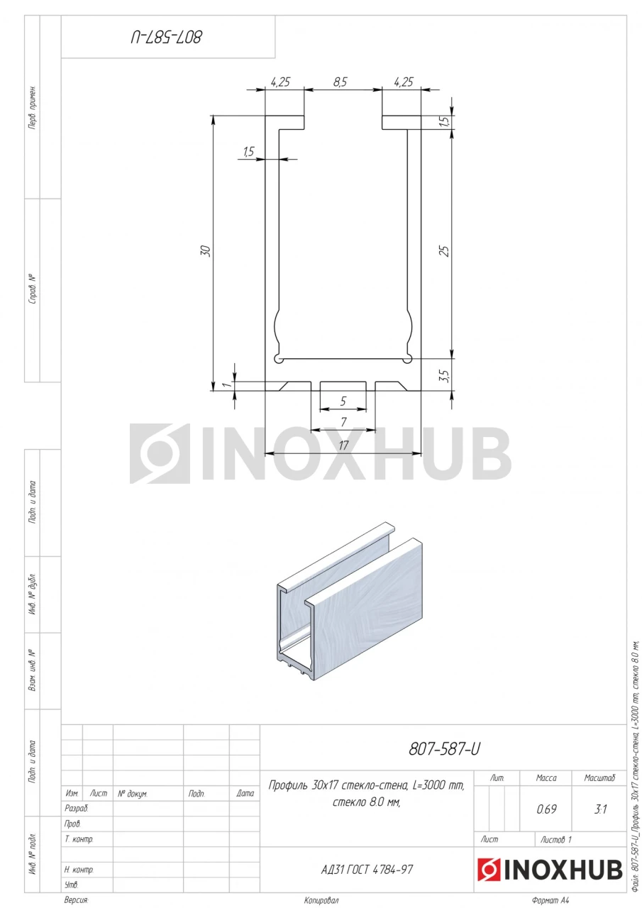 Профиль (587 al) стекло-стена, 30×17 мм L=3000 мм, стекло 8.0 мм, полированный алюминий
