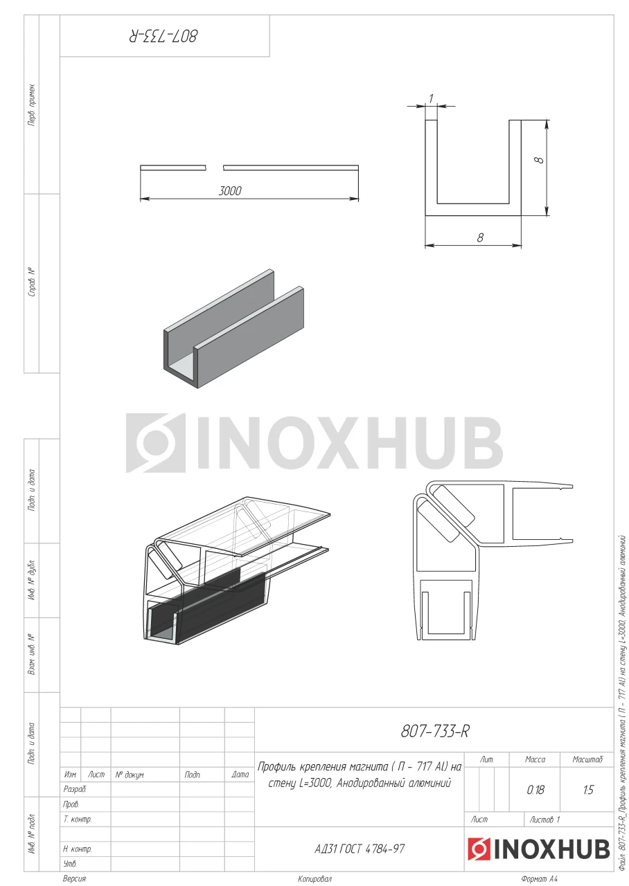 Профиль п-обр. крепления магнита на стену (717-3000 AL), L=3000, Анодированный алюминий