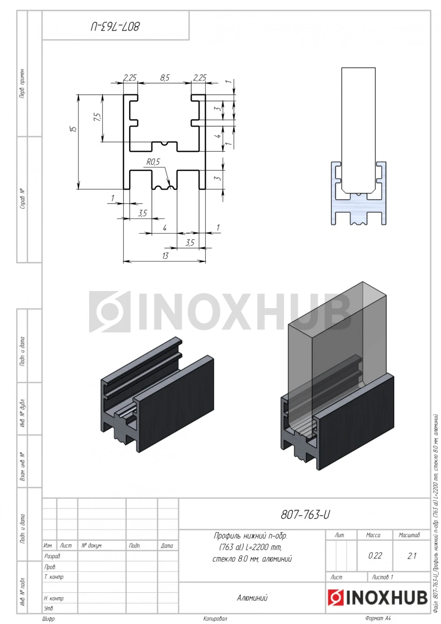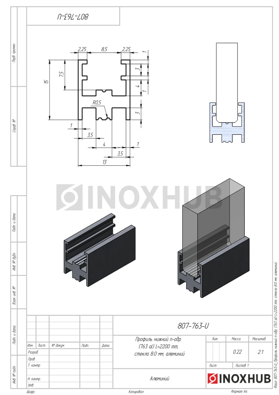 Профиль нижний п-обр. (763 al), L=2200 мм, стекло 8.0 мм, полированный алюминий