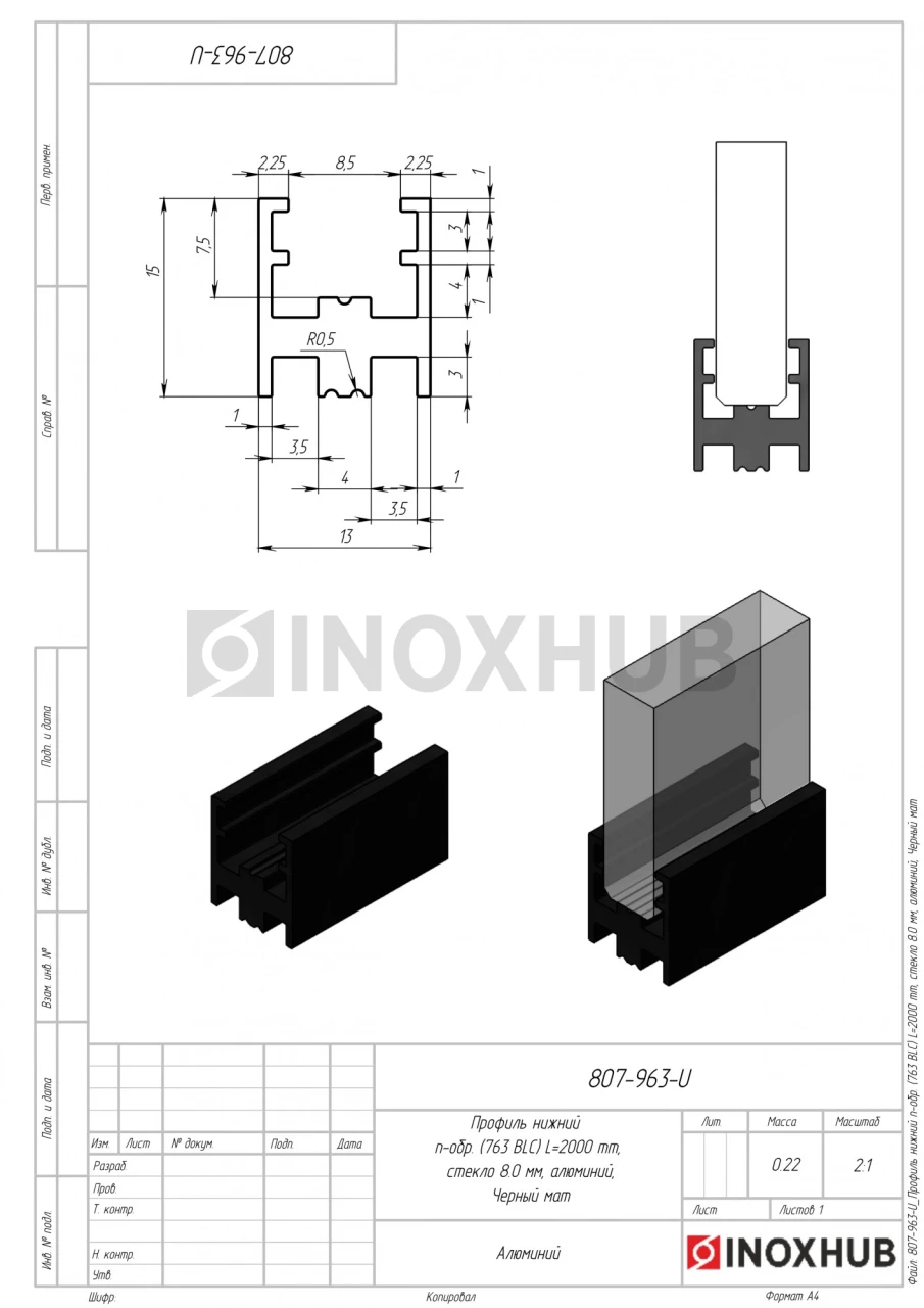 Профиль нижний п-обр. (763 BLC), L=2200 мм, стекло 8.0 мм, алюминий, Черный мат