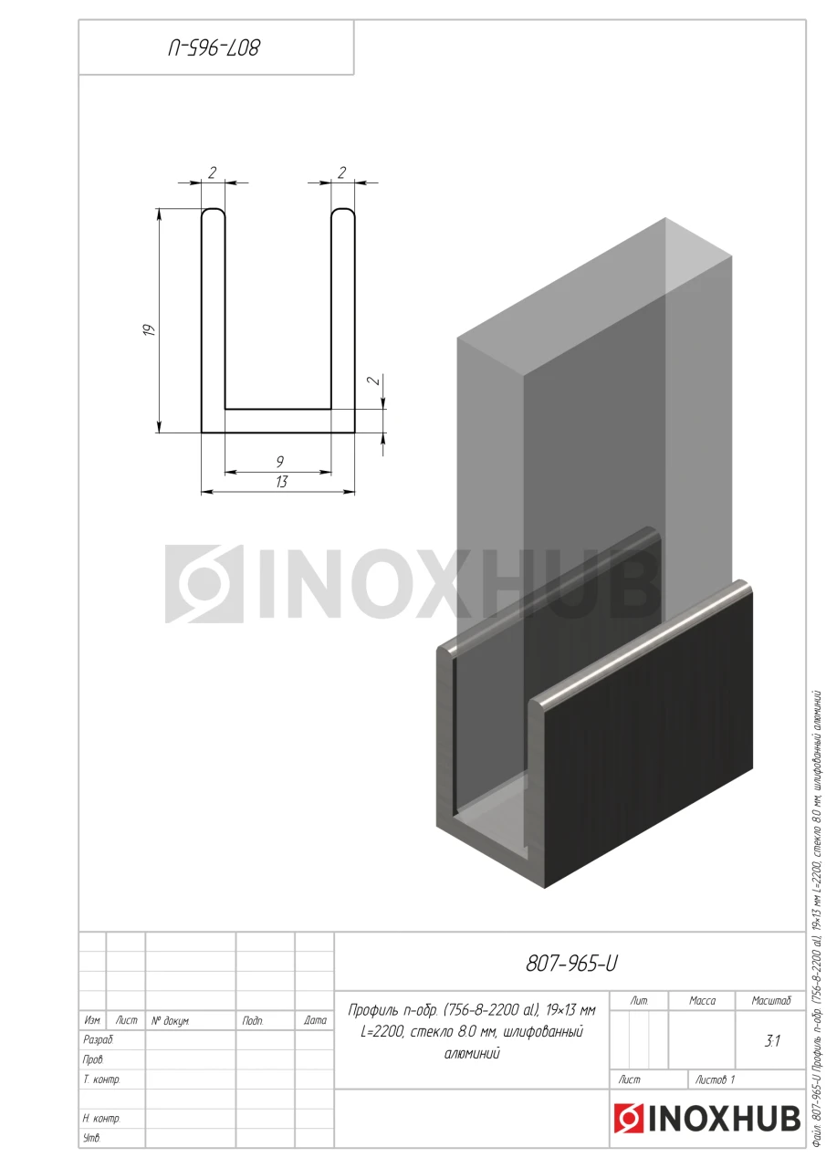 П-образный профиль 19x13 мм изготовлен из экструдированного алюминия. Материал устойчив к коррозии, высокой влажности, перепадам температуры. Легкий вес профиля не нагружает конструкцию. Шлифовка сохраняет первоначальный вид в течение срока эксплуатации. Длина — 2200 мм.