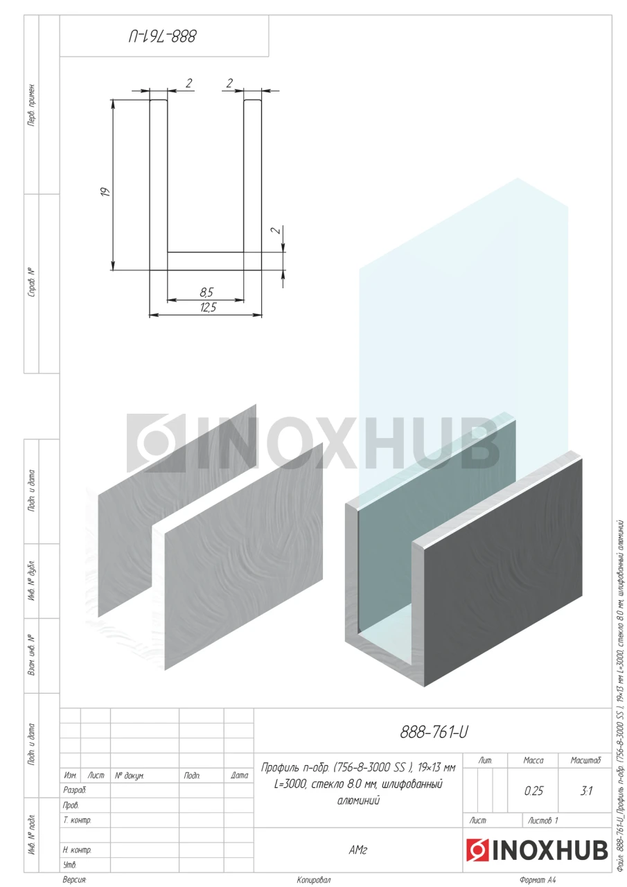 Профиль п-обр. (756-8-3000 AL), 19×13 мм L=3000, стекло 8.0 мм, Анодированный алюминий