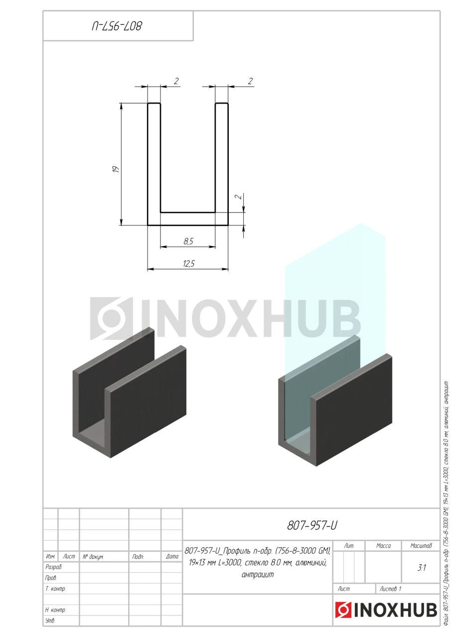 Профиль п-обр. (756-8-3000 GM), 19×13 мм L=3000, стекло 8.0 мм, алюминий, антрацит