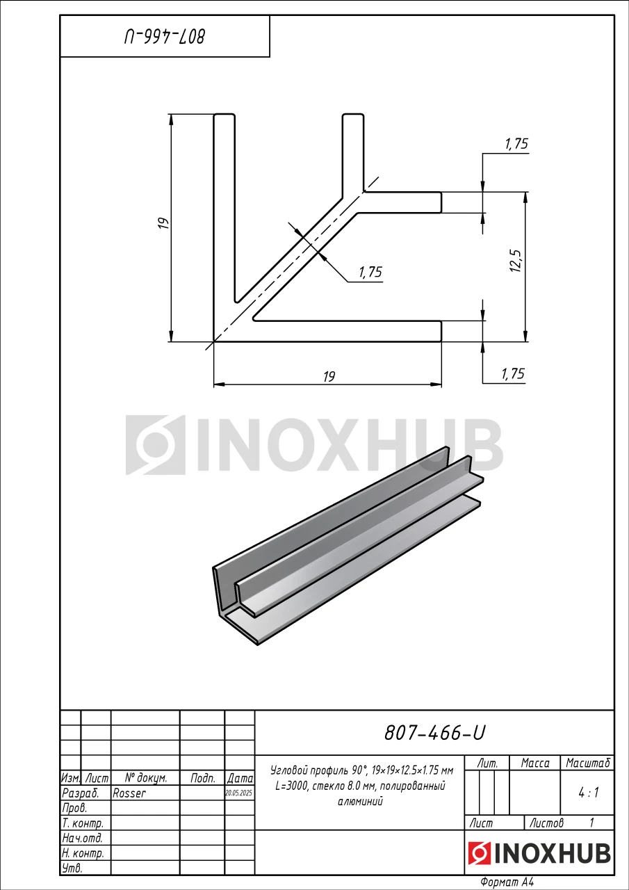 Угловой профиль 90°, 19×19×12.5×1.75 мм L=3000, стекло 8.0 мм, полированный алюминий