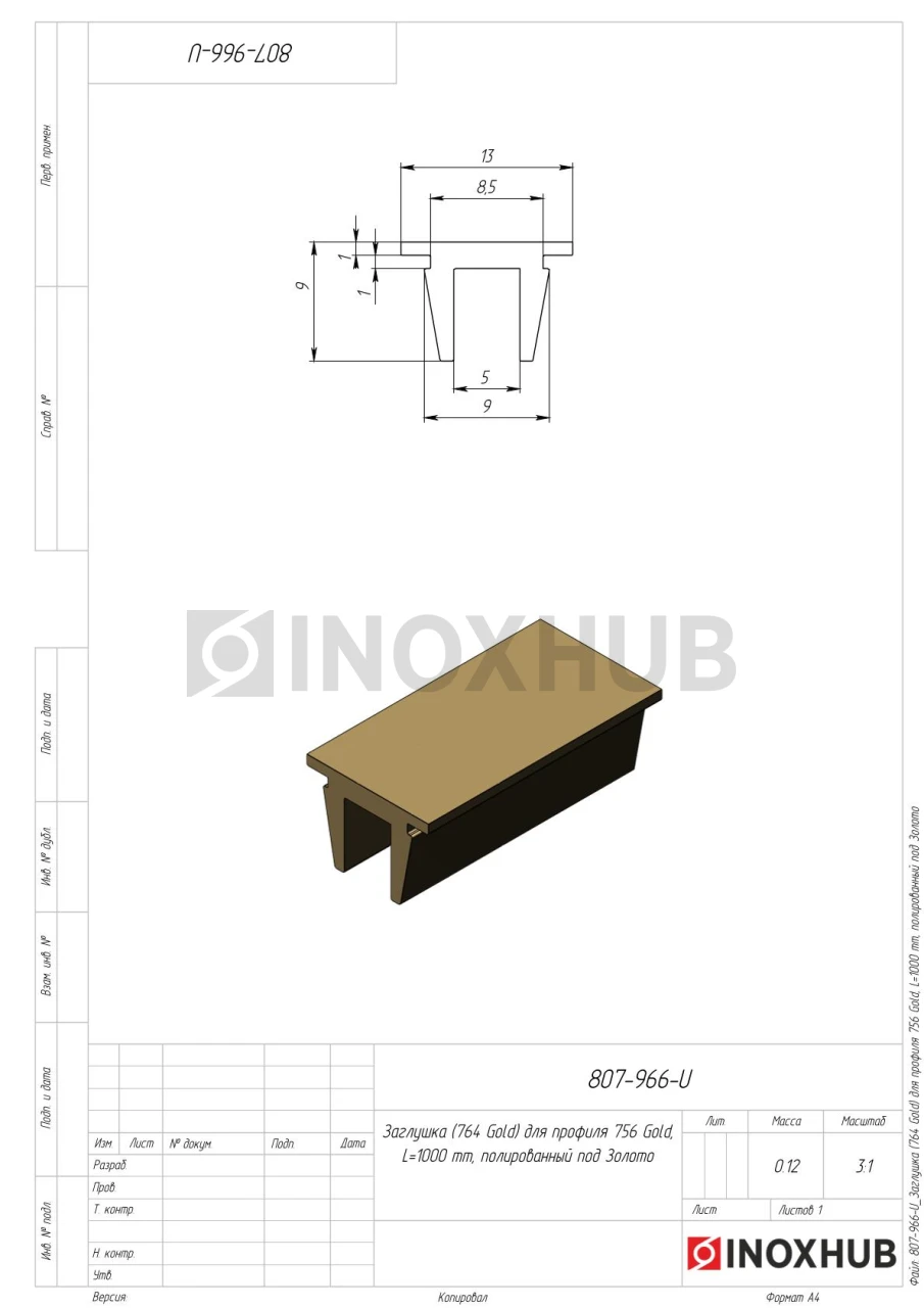 Заглушка (764 Gold) для профиля 763 756, L=1000 мм, алюминий, под Золото