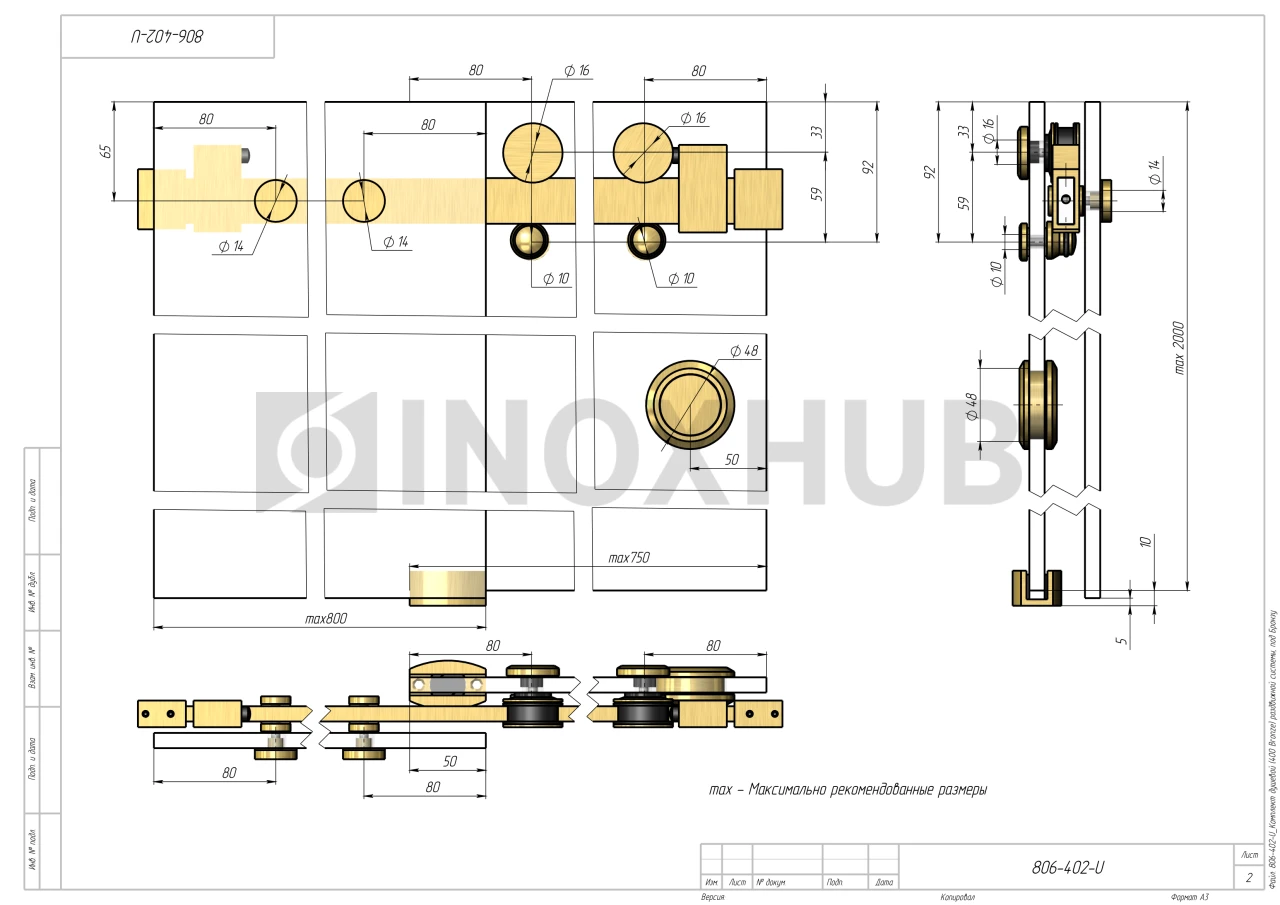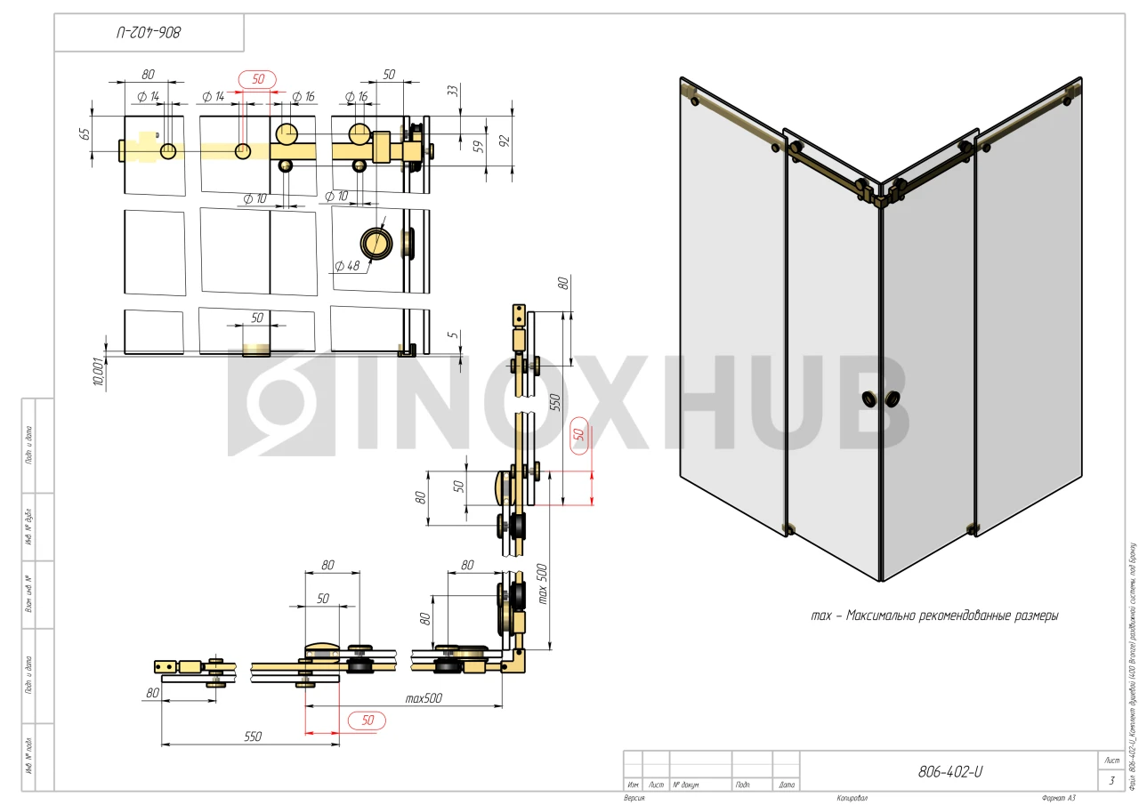 Применение. Комплект предназначен для установки раздвижных систем душевой кабины. Максимальная нагрузка на обе каретки — не более 45 кг. Максимально допустимый размер одной створки — 500х2000 мм. Комплект обеспечивает плавное, практически бесшумное открывание и закрывание дверей.