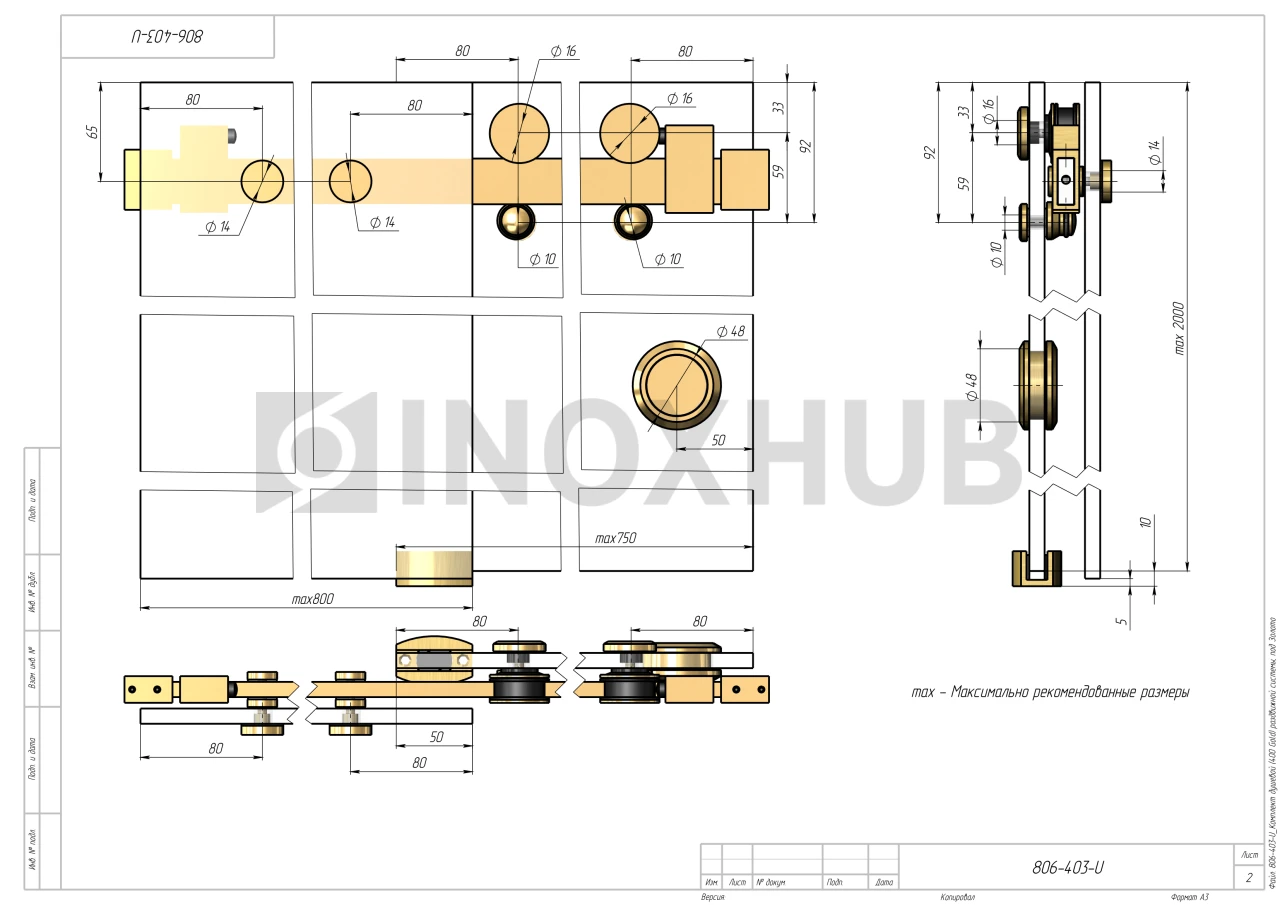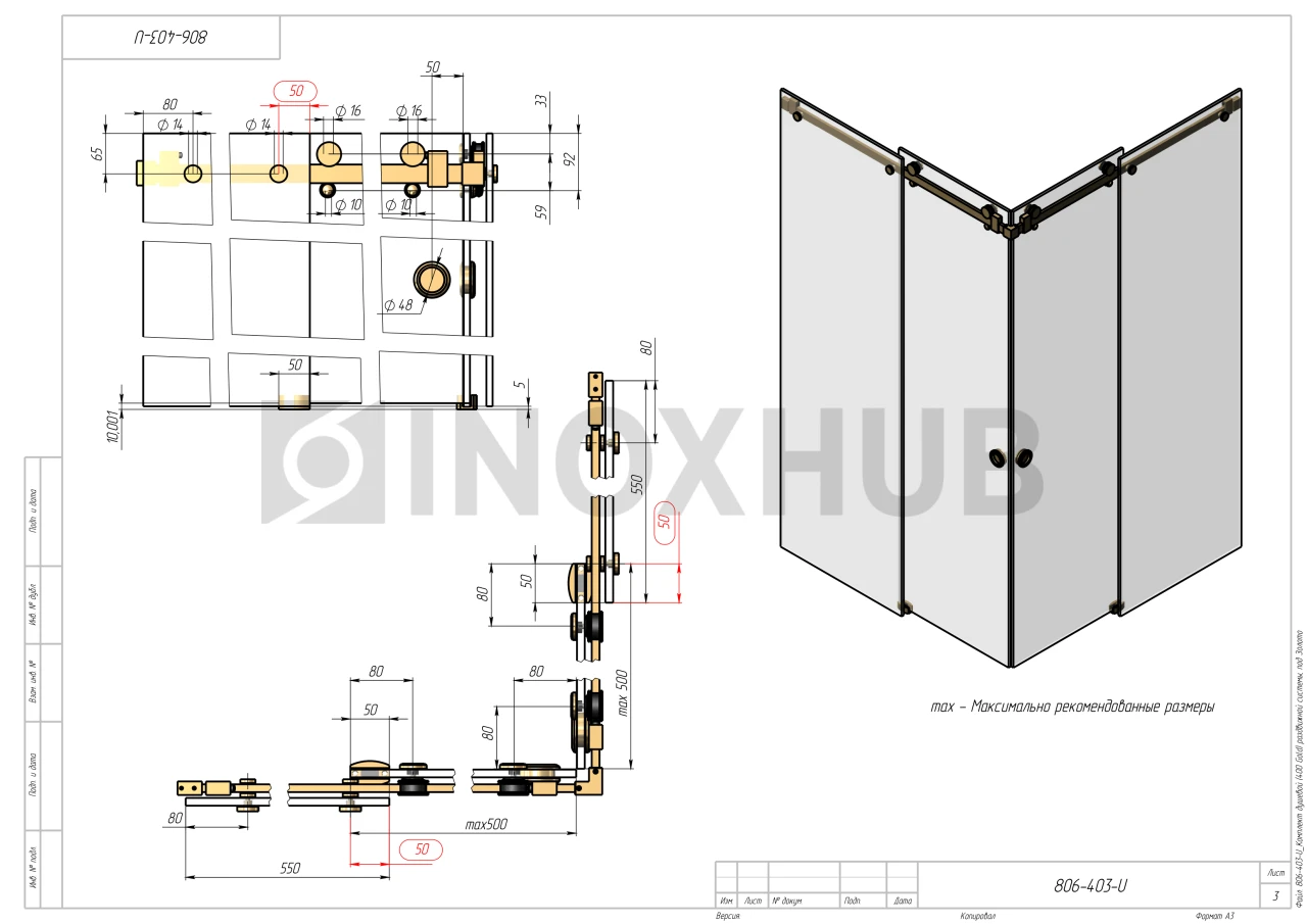 Применение. Комплект предназначен для установки раздвижных систем душевой кабины. Максимальная нагрузка на обе каретки — не более 45 кг. Максимально допустимый размер одной створки при консольном закреплении трека — 500х2000 мм. Комплект обеспечивает плавное, практически бесшумное открывание и закрывание дверей.