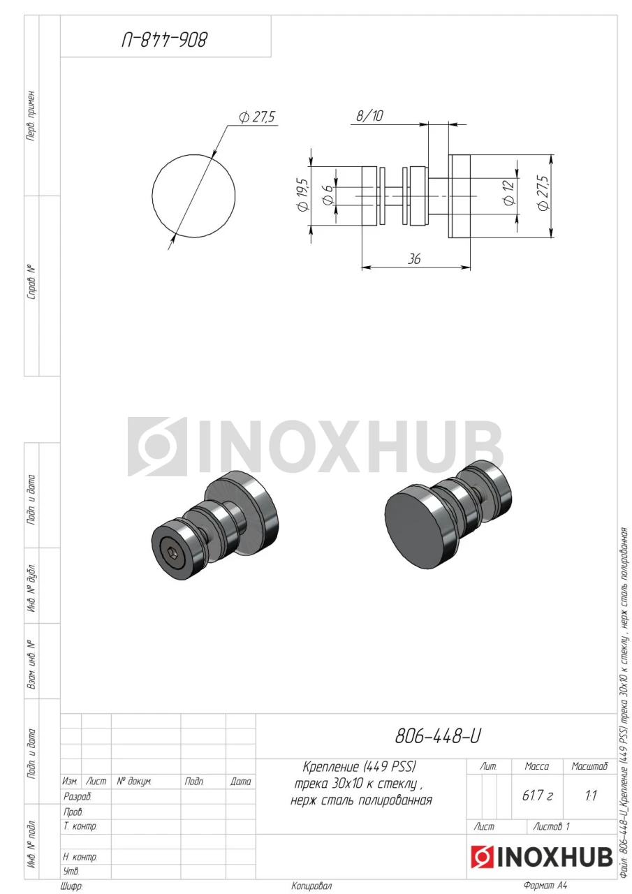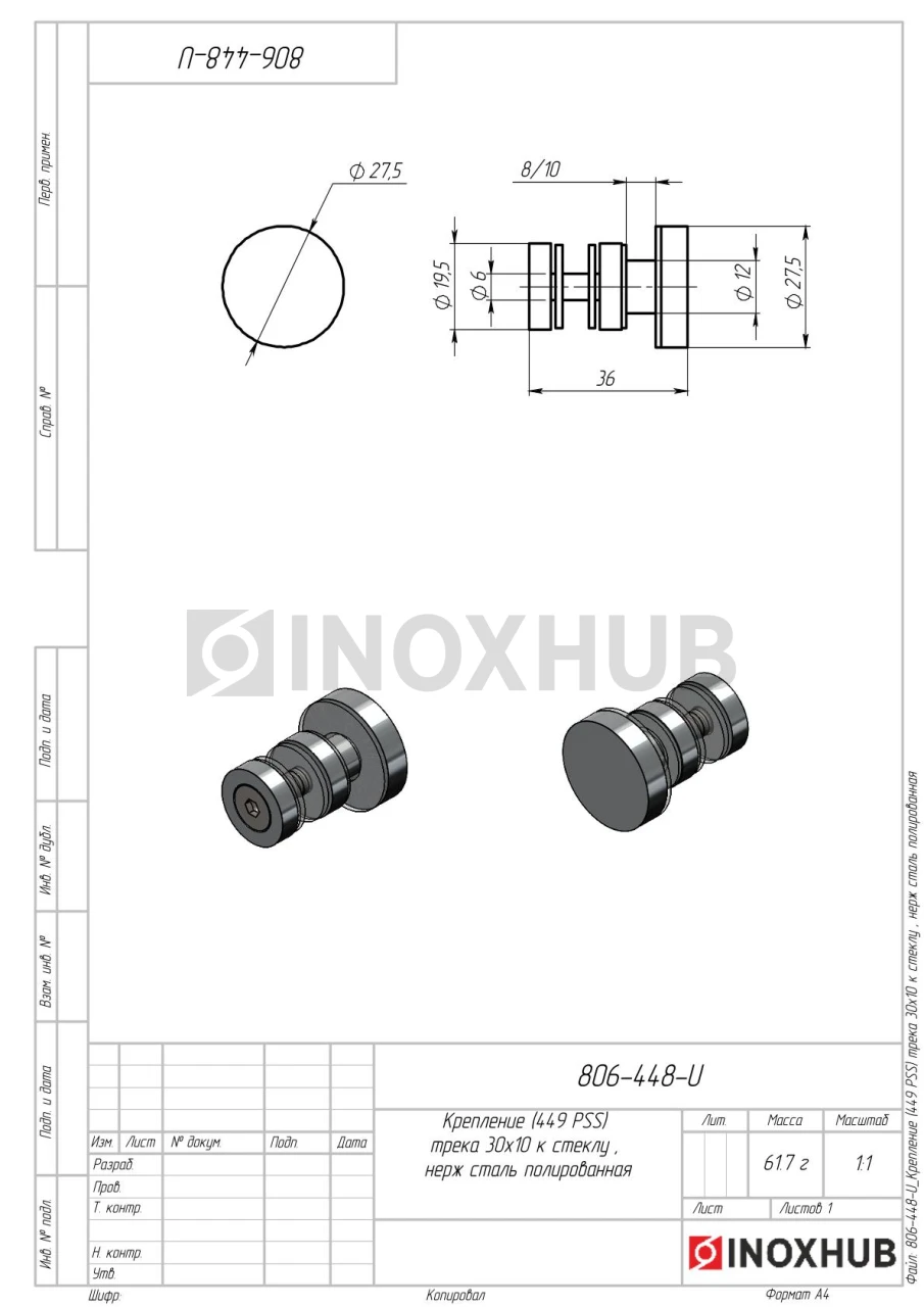 Крепление (449 PSS) трека 30х10 к стеклу , нерж сталь полированная