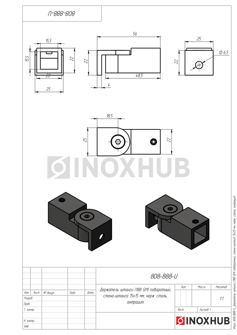 Держатель штанги (188 GM) стена-штанга поворотный, штанга 15×15 мм, нерж. сталь, антрацит