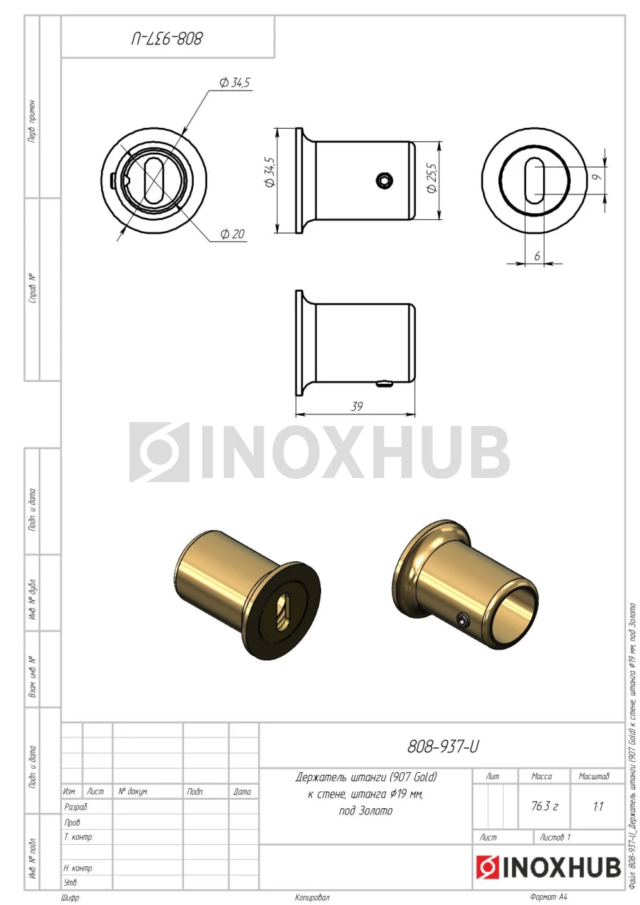 Держатель штанги (907 Gold) к стене, штанга Ø19 мм, под Золото