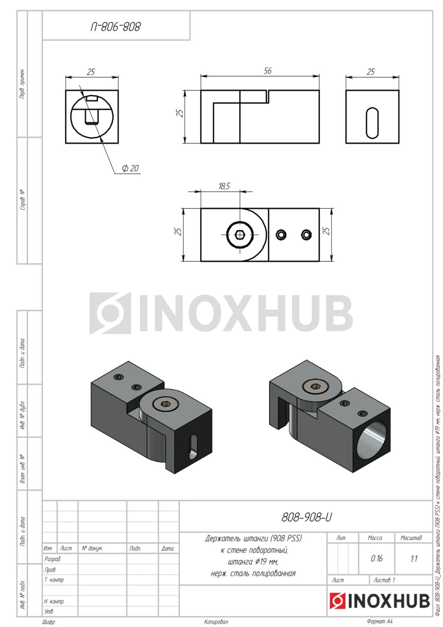 Держатель штанги (908 PSS) к стене поворотный, штанга Ø19 мм, нерж. сталь полированная