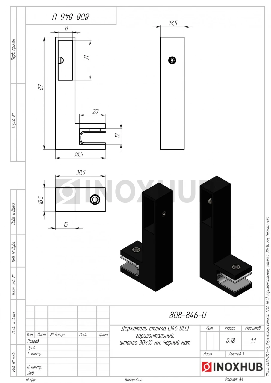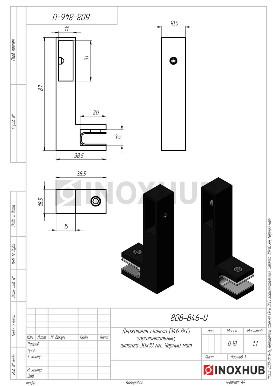 Держатель стекла (346 BLC) горизонтальный, штанга 30×10 мм, Черный мат