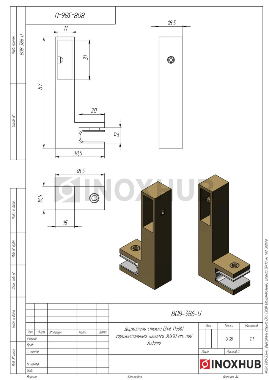 Держатель стекла (346 Gold) горизонтальный, штанга 30×10 мм, под Золото