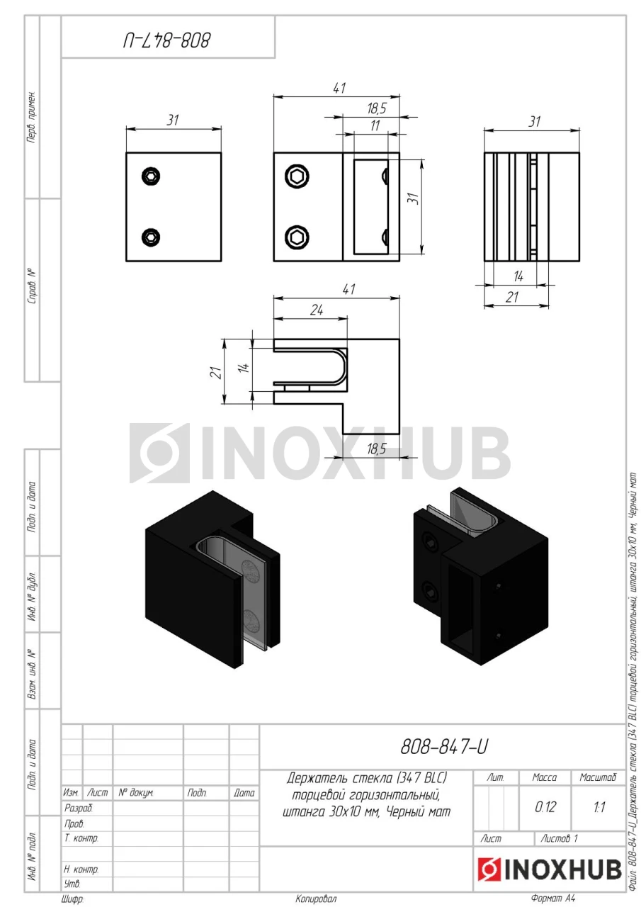Держатель стекла (347 BLC) торцевой горизонтальный, штанга 30×10 мм, Черный мат