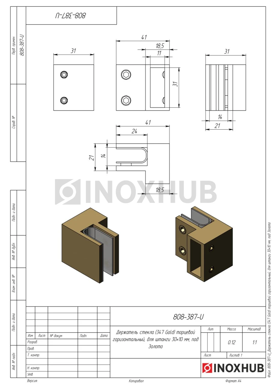 Держатель стекла (347 Gold) торцевой горизонтальный, штанга 30×10 мм, под Золото