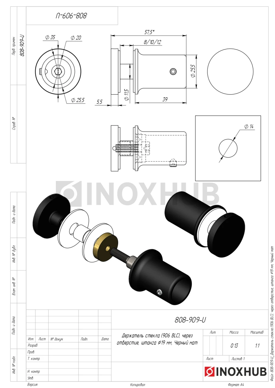 Держатель стекла (906 BLC), через отверстие, штанга Ø19 мм, Черный мат