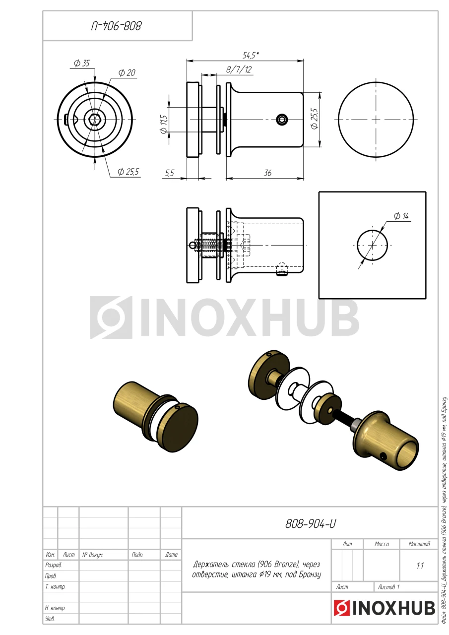 Держатель стекла (906 Bronze), через отверстие, штанга Ø19 мм, под Бронзу