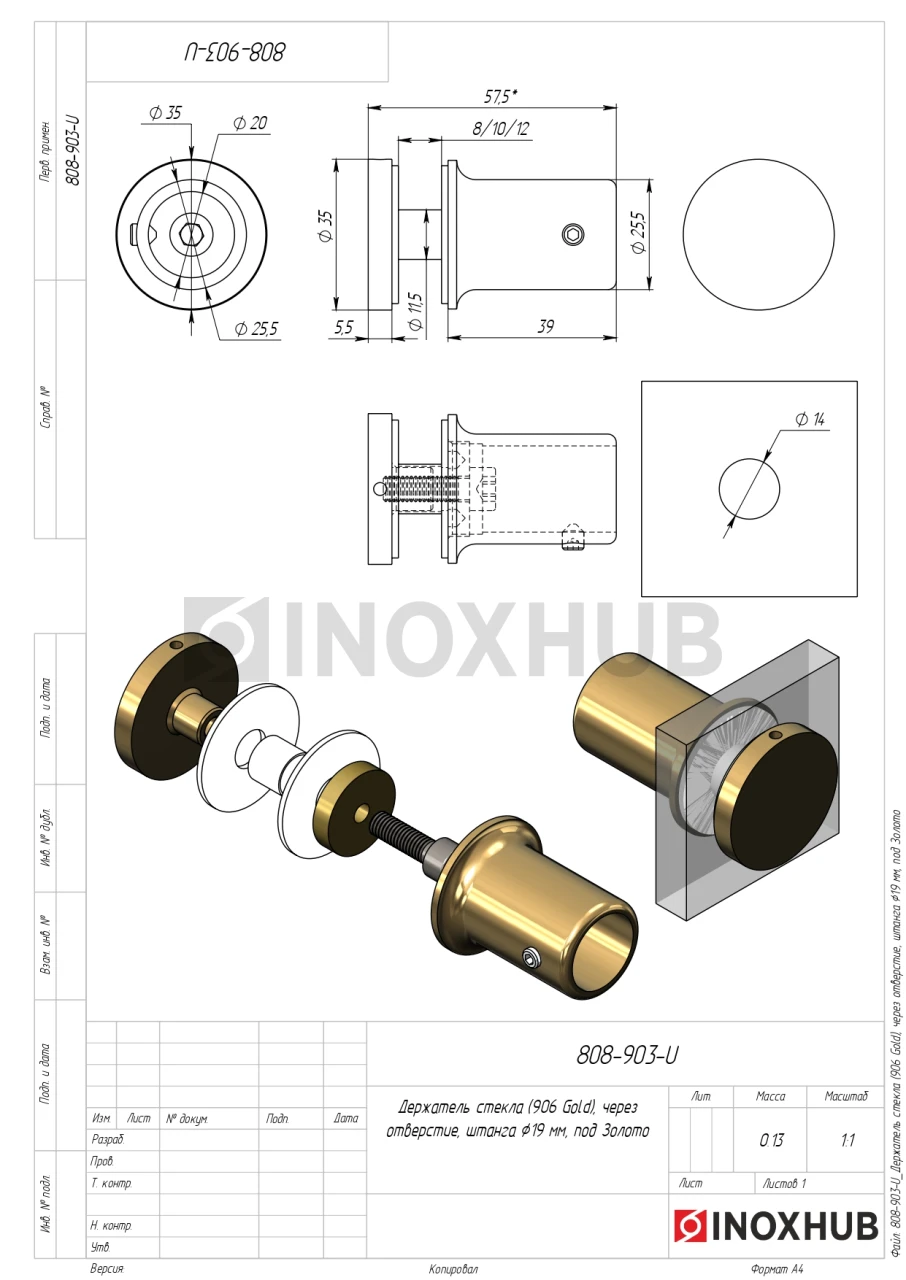 Держатель стекла (906 Gold), через отверстие, штанга Ø19 мм, под Золото
