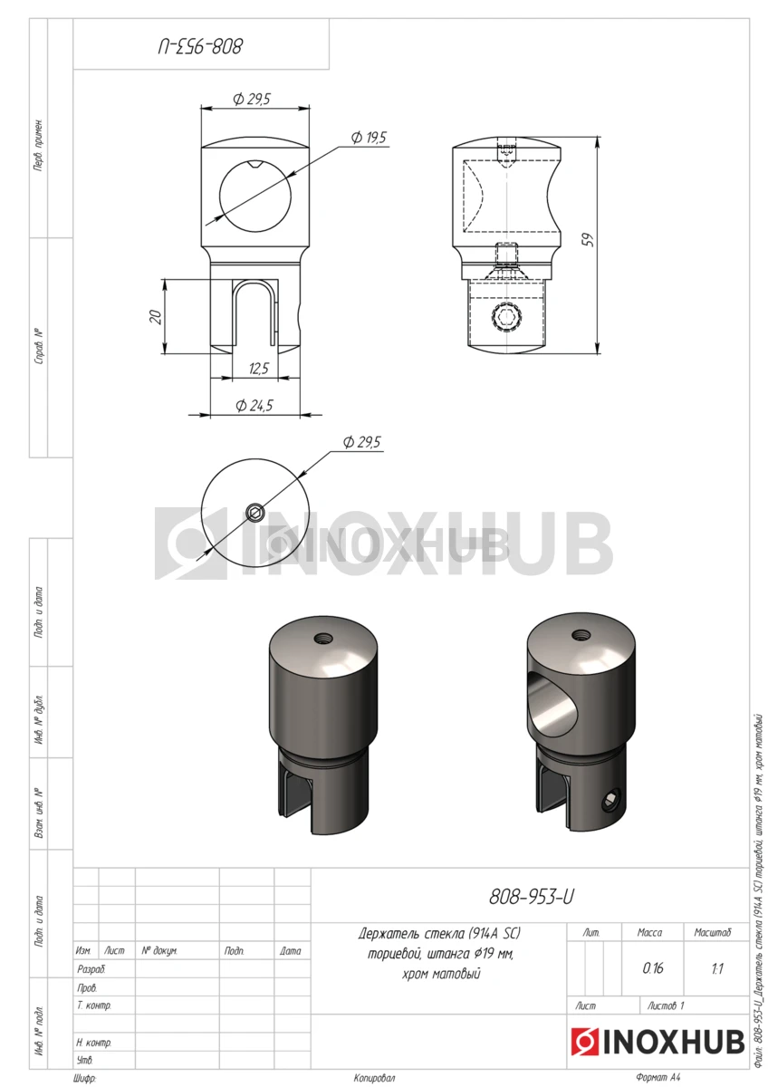 Держатель стекла (914А SC) торцевой, штанга Ø19 мм, матовый хром