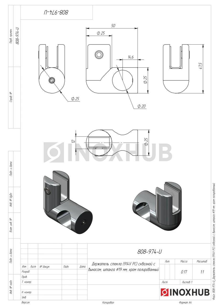 Держатель стекла (914V PC) сквозной с выносом, штанга Ø19 мм, полированный хром