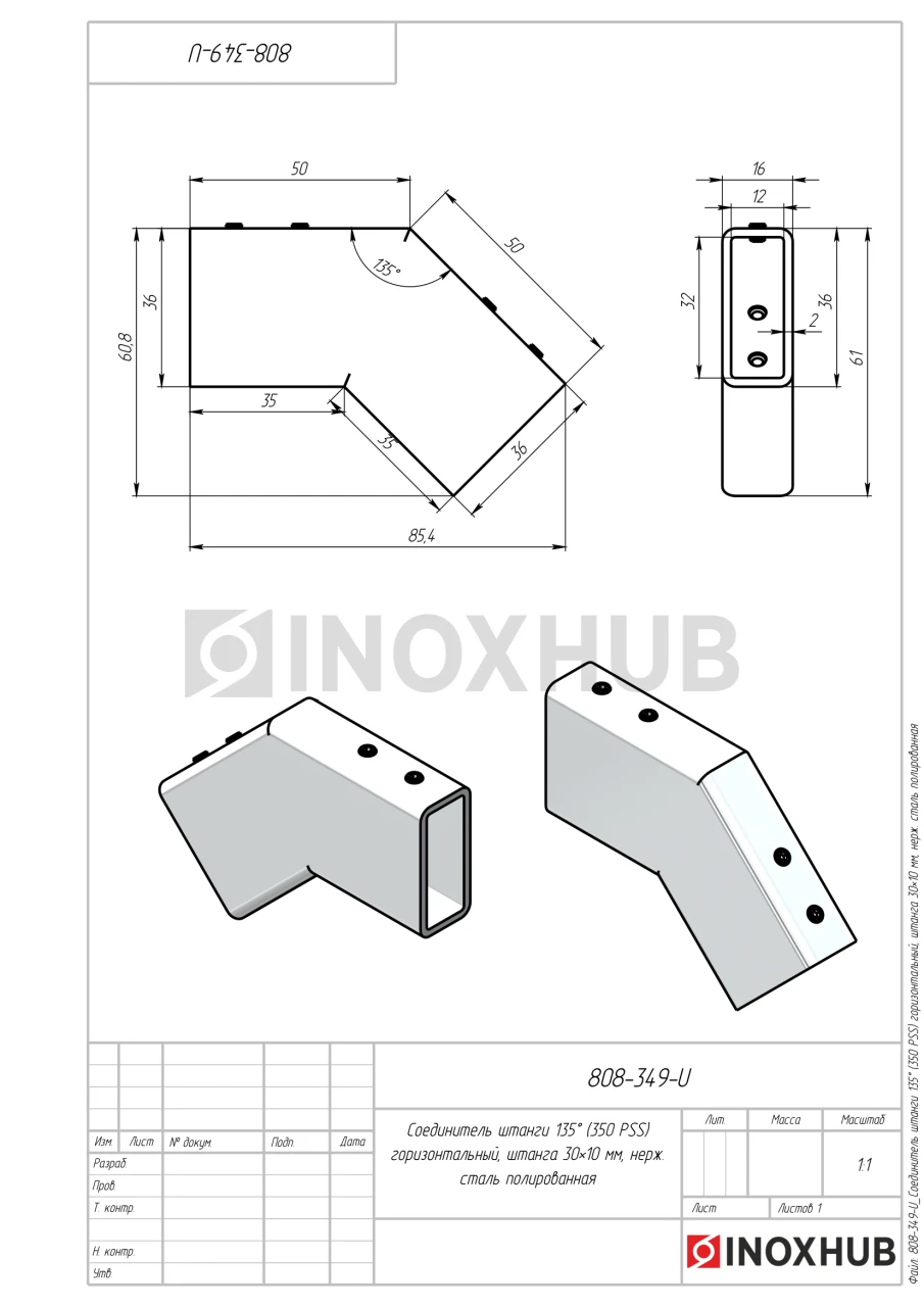 Соединитель штанги 135° (350 PSS) горизонтальный, штанга 30×10 мм, нерж. сталь полированная