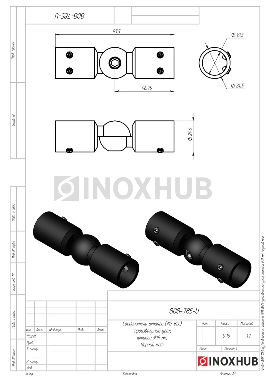Соединитель штанги (915 BLC) произвольный угол, штанга Ø19 мм, Черный мат
