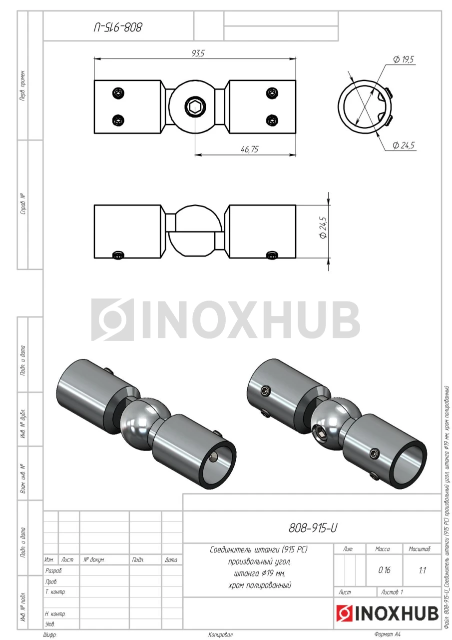 Соединитель штанги (915 PC) произвольный угол, штанга Ø19 мм, полированный хром