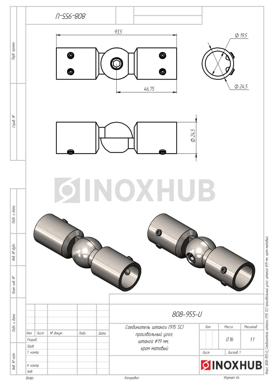 Соединитель штанги (915 SC) произвольный угол, штанга Ø19 мм, матовый хром