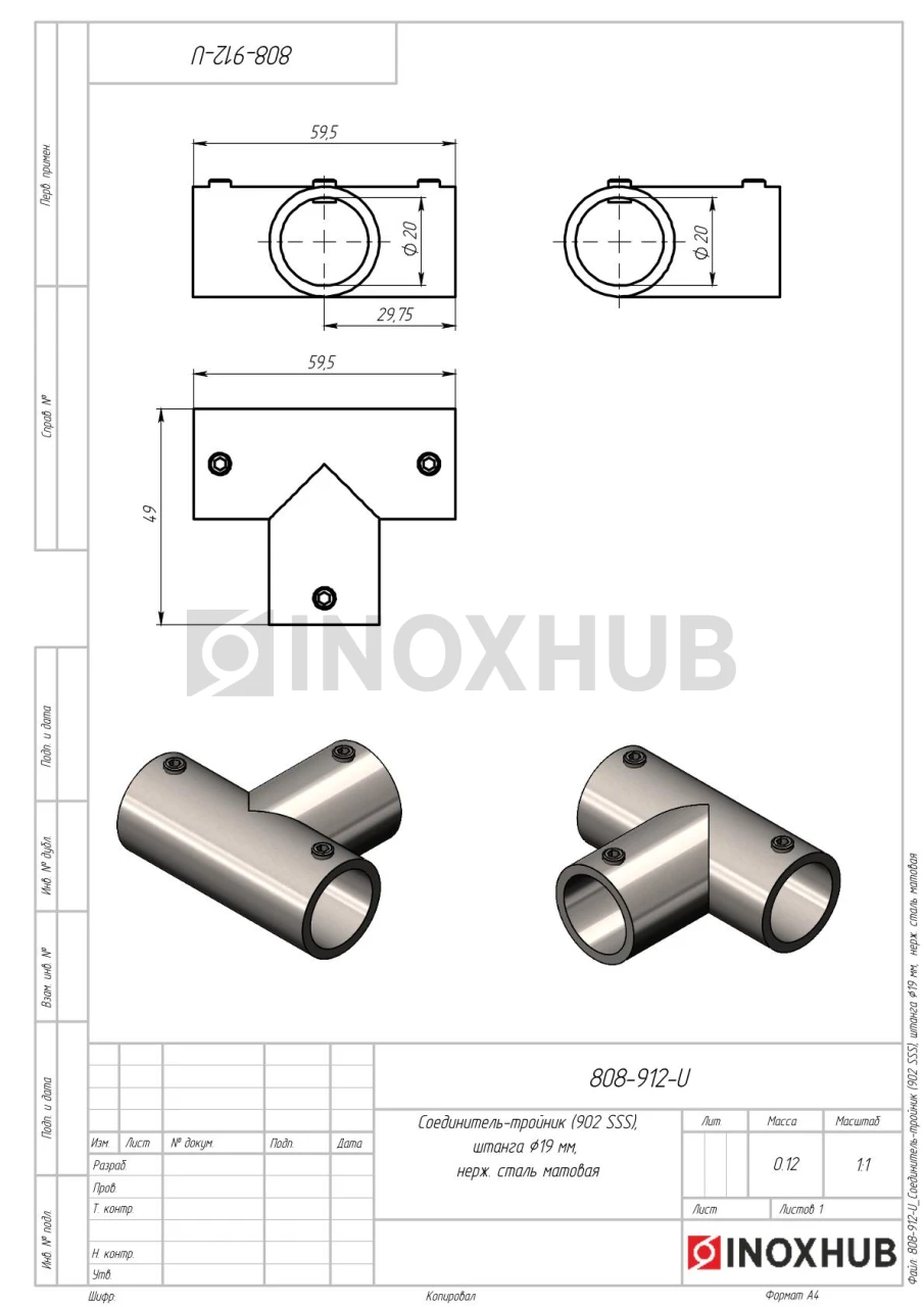 Соединитель-тройник (902 SSS), штанга Ø19 мм, нерж. сталь матовая