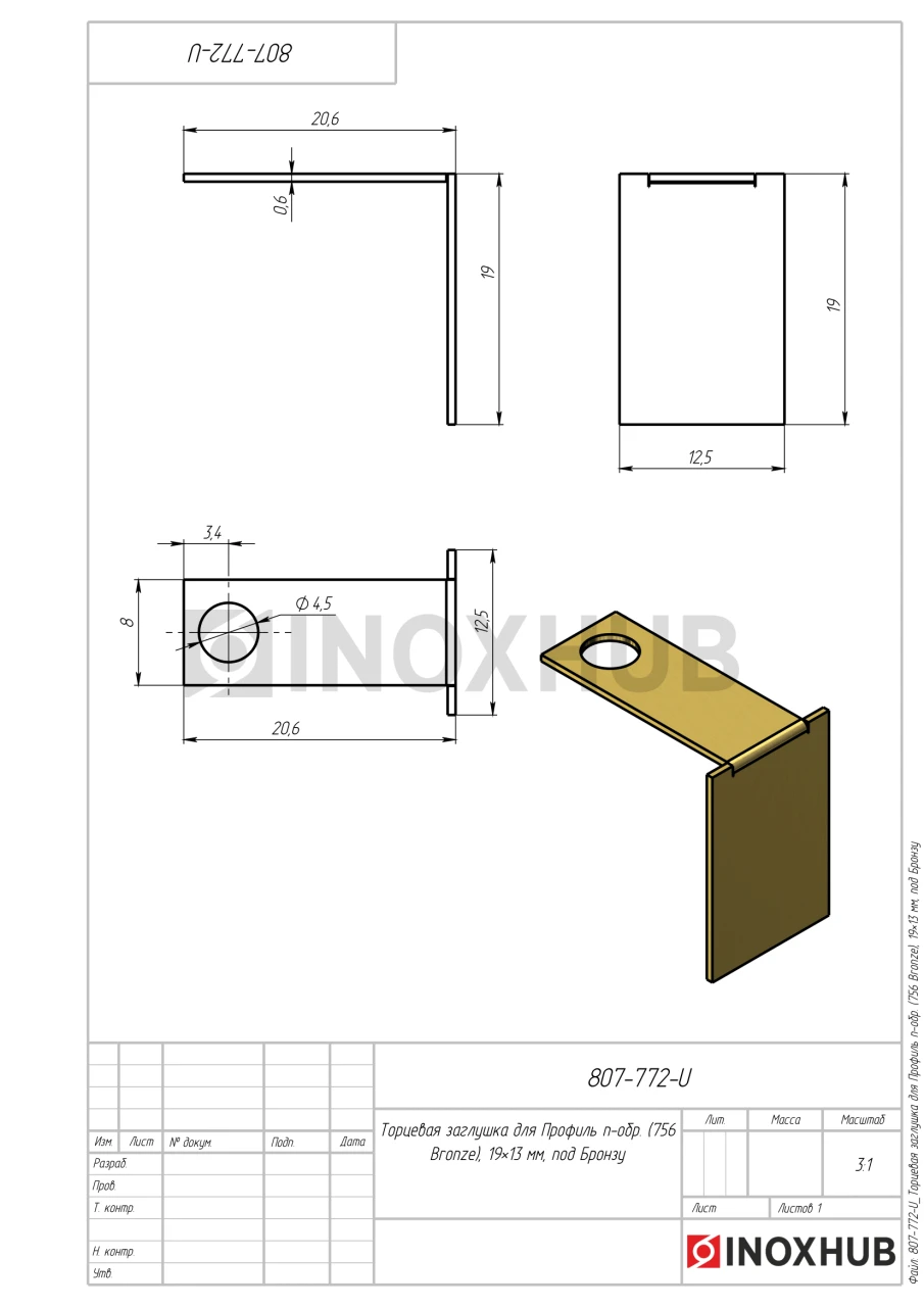 Торцевая заглушка для Профиль п-обр. (756 Bronze), 19×13 мм, под Бронзу