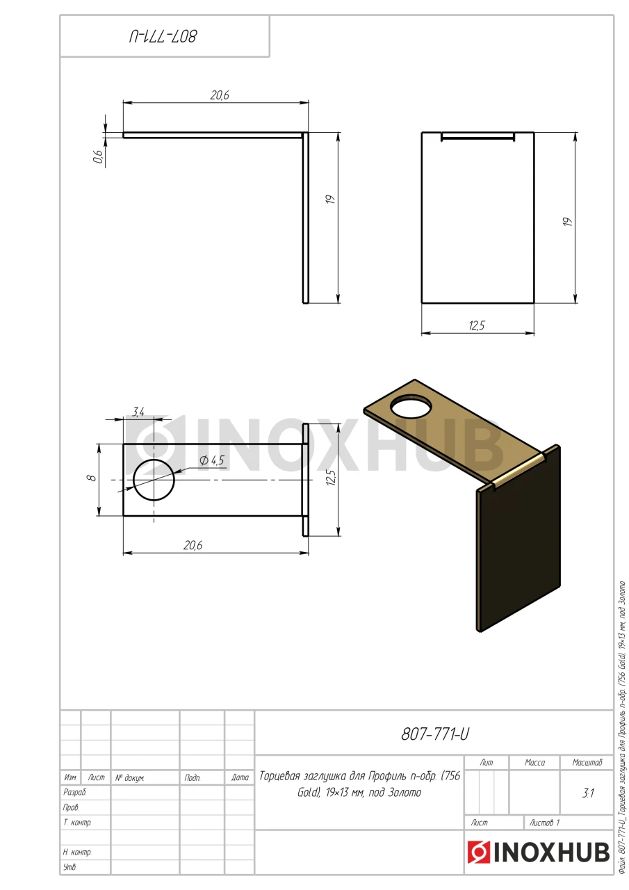 Торцевая заглушка для Профиль п-обр. (756 Gold), 19×13 мм, под Золото