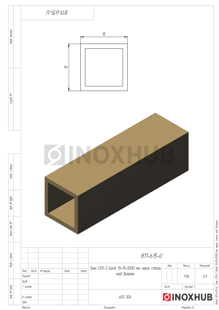 Трек (315-3 Gold), 15×15×3000 мм, нерж. сталь под Золото