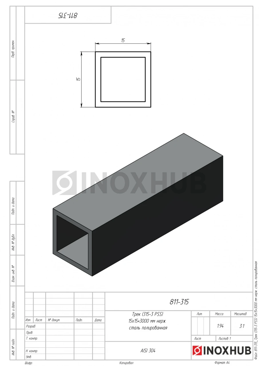 Трек (315-3 PSS), 15×15×3000 мм, нерж. сталь полированная