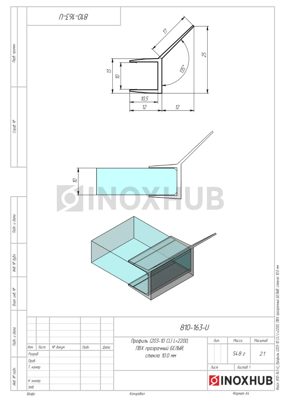 Профиль (203-10 CL), L=2200, стекло 10.0 мм, ПВХ прозрачный БЕЛЫЙ