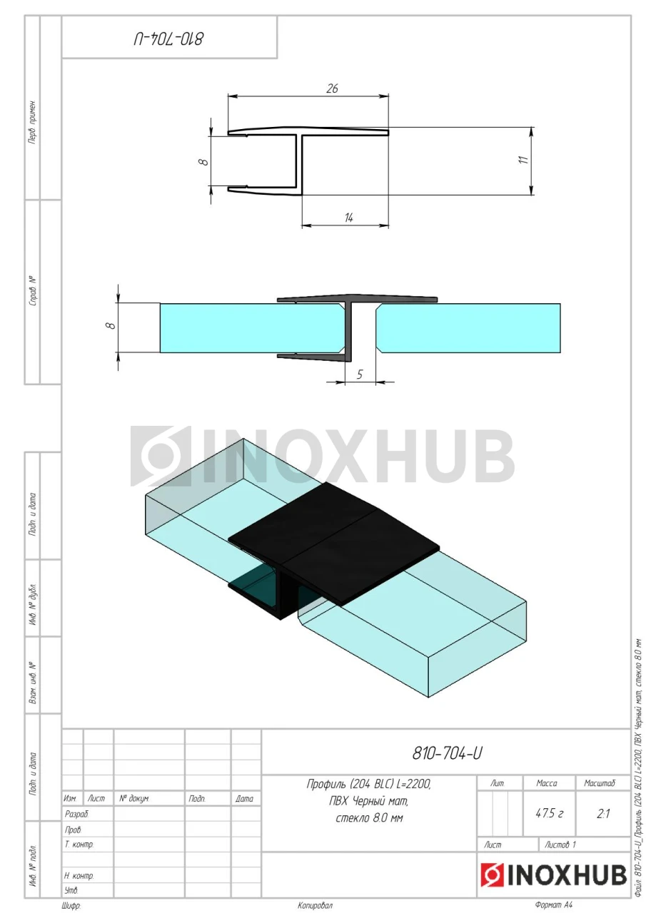 Профиль (204-8 BLC), L=2200, стекло 8.0 мм, ПВХ Черный мат