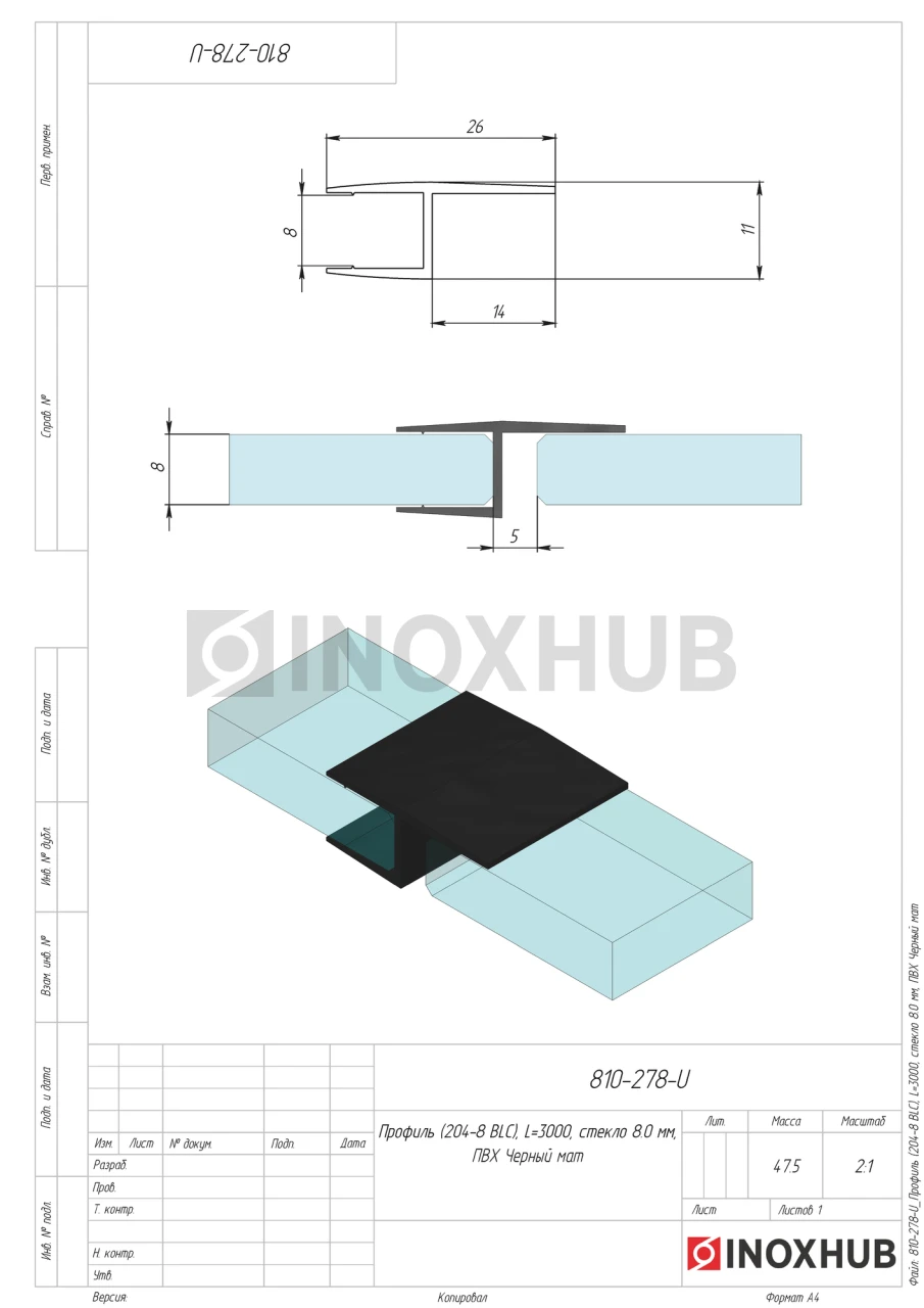 Профиль (204-8 BLC), L=3000, стекло 8.0 мм, ПВХ Черный мат