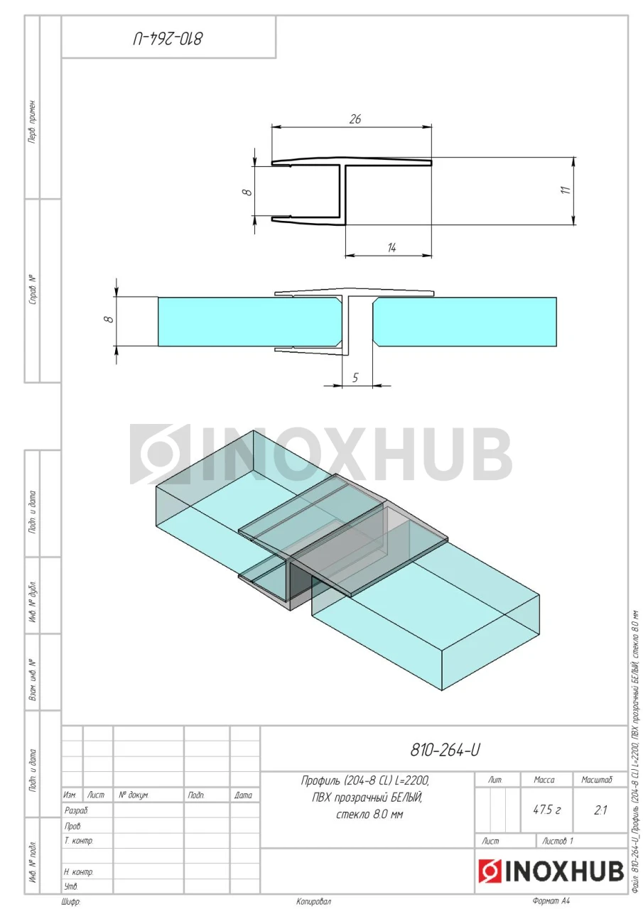 Профиль (204-8 CL), L=2200, стекло 8.0 мм, ПВХ прозрачный БЕЛЫЙ